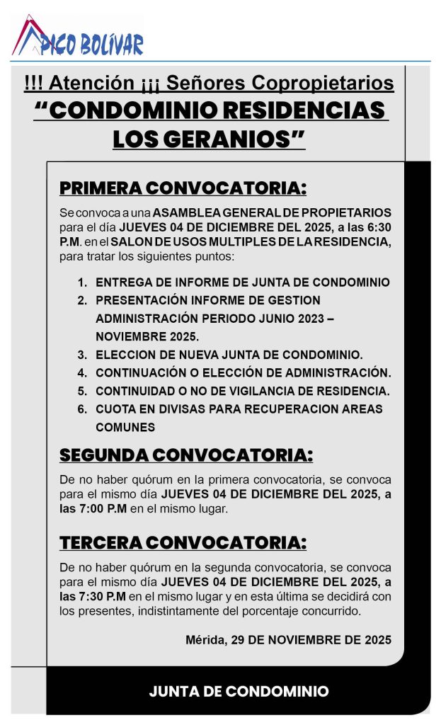 Home Avisos Legales📢 ¡¡¡Atención Señores Copropietarios!!! Convocatoria Oficial a la Asamblea General del Condominio Residencias Los Geranios para la Presentación de Informes, Elección de Nueva Junta y Toma de Decisiones Administrativas Importantes
