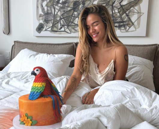 En la imagen, Karol G aparece sonriente en la cama junto a un pastel decorado con la figura de un guacamayo.