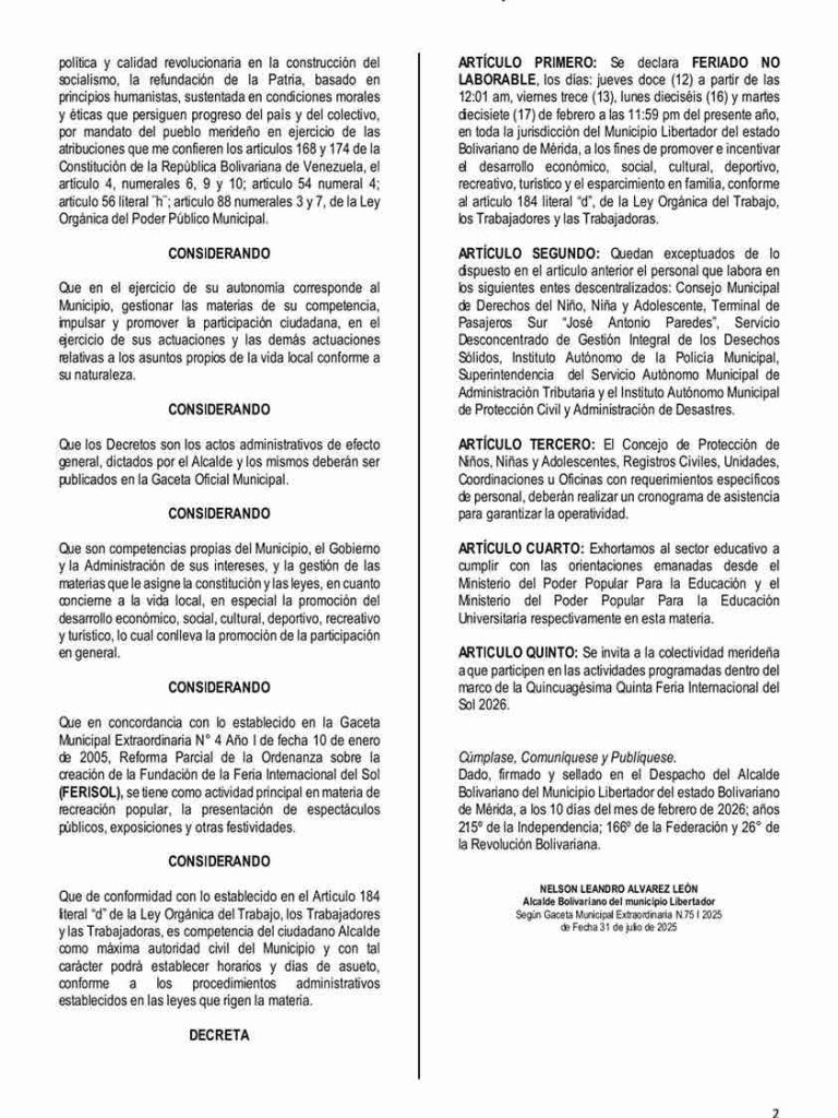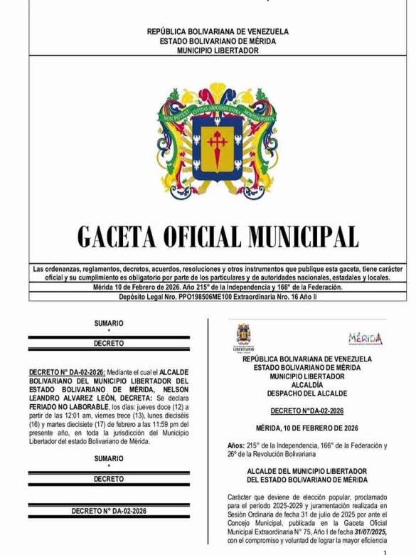 La Alcaldía del Municipio Libertador del estado Bolivariano de Mérida informa que, mediante Gaceta oficial 10 de Febrero de 2026. Decreto N°DA-02-2026, se declara feriado no laborable los días jueves 12 (a partir de las 12:01 a.m.), viernes 13, lunes 16 y martes 17 de febrero (hasta las 11:59 p.m.) del presente año, en toda la jurisdicción del municipio.