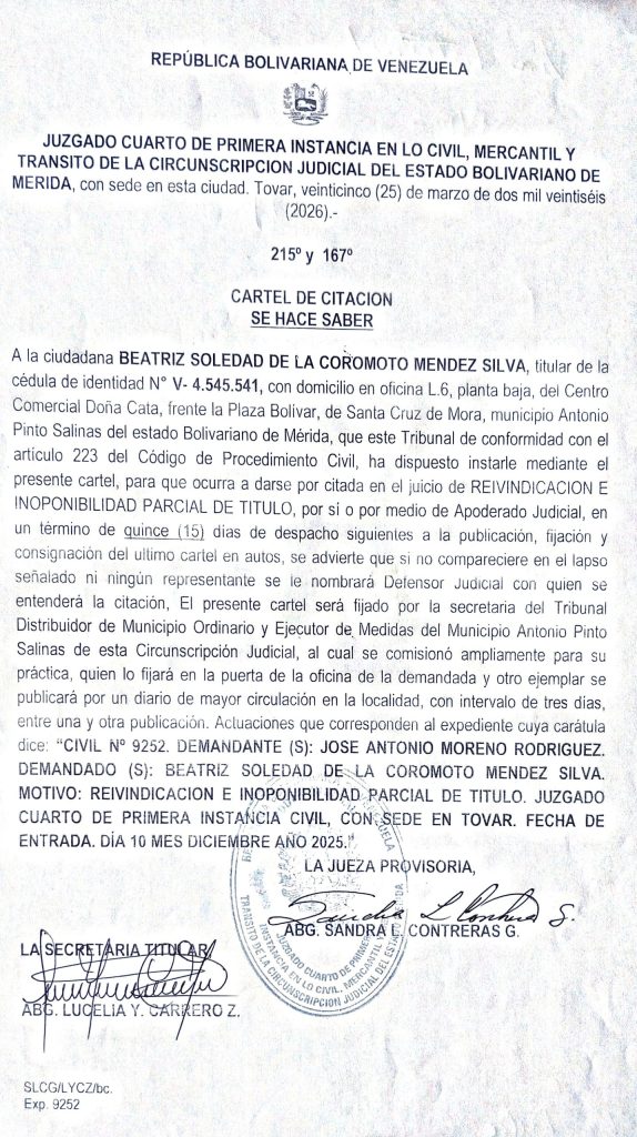 32 0 comentarios 0 FacebookTwitterPinterestEmail Redacción web publicación anterior Padre e hijo oriundos de La Grita son ultimados para no pagarles deuda publicación siguiente Edicto se hace saber a todas las personas con interés directo y manifiesto que ha sido promovida acción por apertura de testamento cerrado por el ciudadano Carlos David Durán Valero, en su carácter de albacea testamentario, en relación con los ciudadanos Fabián Reinaldo Nava Rojas, José Gustavo Nava Rojas y Mireya Socorro Nava Rojas, según expediente N° 12.011, ordenándose su publicación y llamado a interesados conforme a derecho. (17-04-2026) Related Articles EDICTO SE HACE SABER: A quienes tengan interés en el... 21 de abril de 2026 Cartel hace saber: Constitución de Hogar a favor... 21 de abril de 2026 CARTE SE HACE SABER Al ciudadano ABEL ZERPA... 21 de abril de 2026 CARTEL SE HACE SABER Al ciudadano ABEL ZERPA... 20 de abril de 2026 CARTEL DE CITACION HACE SABER:A la SOCIEDAD MERCANTIL... 18 de abril de 2026 EDICTO LUIS GERARDO RONDON. EXP N° 0124-2025 17 de abril de 2026 Edicto se hace saber a todas las personas... 17 de abril de 2026 Edicto a las Personas con Interés Directo en... 16 de abril de 2026 Cartel Se Hace Saber a cuantas personas puedan... 16 de abril de 2026 Edicto: Se hace saber a todas aquellas personas... 15 de abril de 2026