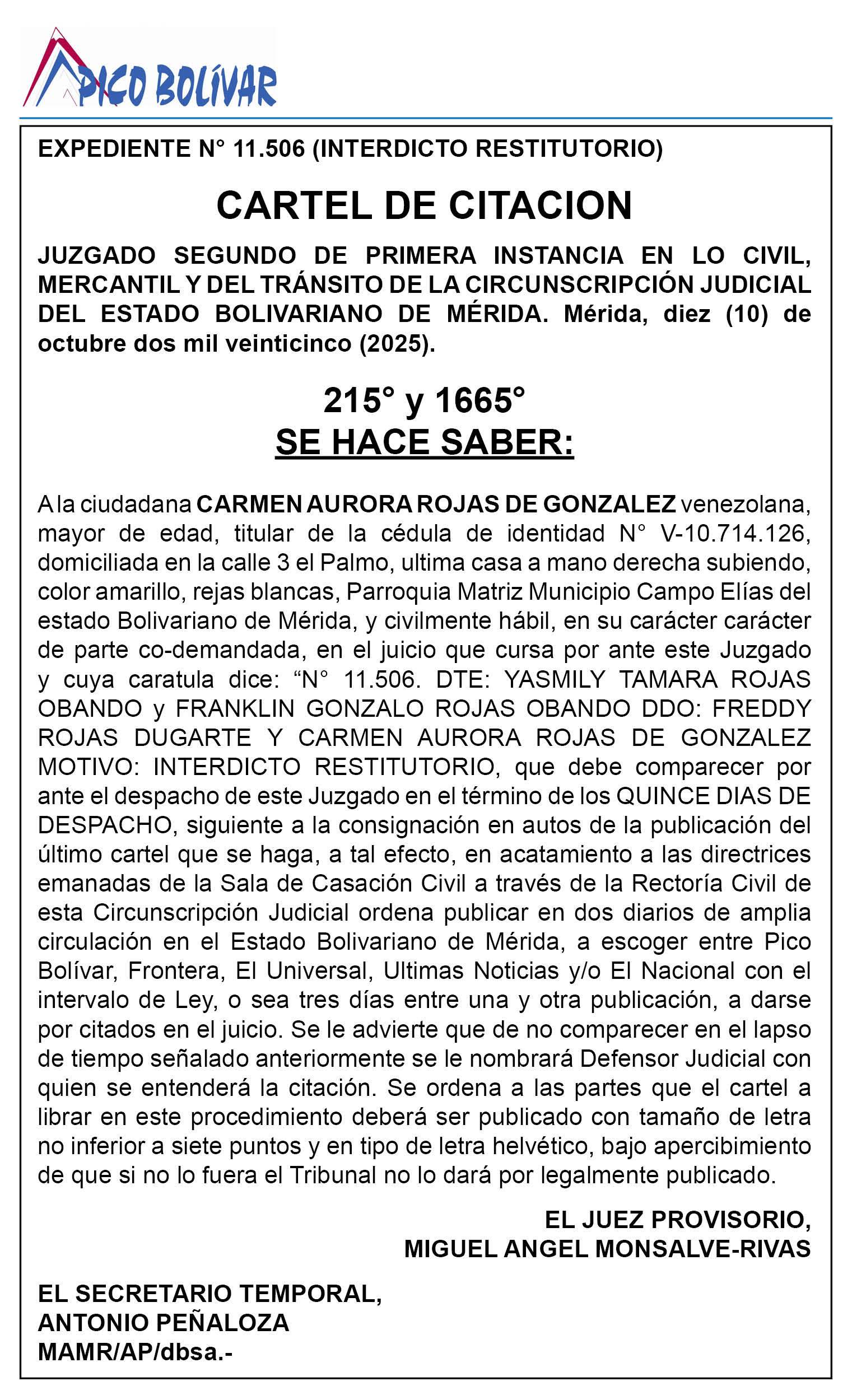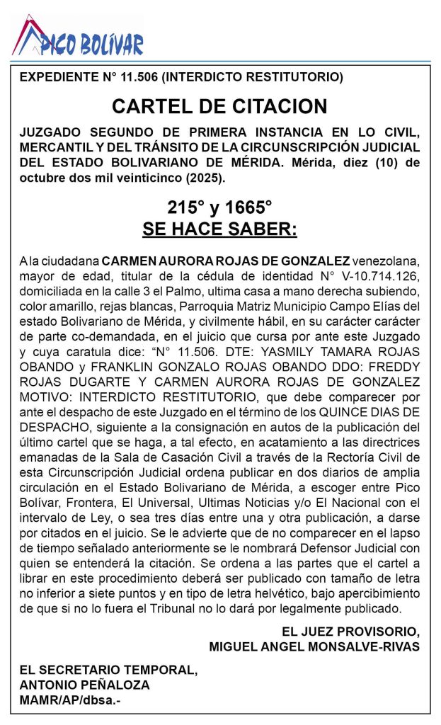 21 0 comentarios 0 FacebookTwitterPinterestEmail Redacción web publicación anterior Cartel de citación a la ciudadana MARIA MATILDE CHACON MENDEZ, títular de la cédula de identidad Nº 4.468.438 publicación siguiente Cartel de Citación al ciudadano FREDY ROJAS DUGARTE, titular de la cédula de identidad N° V-8.045.126 Related Articles Convocatoria a Asamblea General de Propietarios Condominio “Residencias... 25 de noviembre de 2025 Él Impreso Avisos Legales 25 de noviembre de 2025 PRESCRIPCIÓN ADQUISITIVA – EDICTO Se hace saber que... 24 de noviembre de 2025 SE HACE SABER: A la ciudadana PAOLA PATRICIA... 24 de noviembre de 2025 EDICTO Se hace saber a los herederos desconocidos del... 24 de noviembre de 2025 CARTEL DE NOTIFICACIÓN A la Ciudadana ANYOLINY DEL... 23 de noviembre de 2025 Tribunal Quinto de Municipio Ordinario y Ejecutor de... 23 de noviembre de 2025 CARTEL DE CITACIÓN Al ciudadano ADELXO ROJAS ROJAS,... 22 de noviembre de 2025 Cartel de Citación al ciudadano FREDY ROJAS DUGARTE,... 22 de noviembre de 2025 Cartel de citación a la ciudadana MARIA MATILDE... 22 de noviembre de 2025