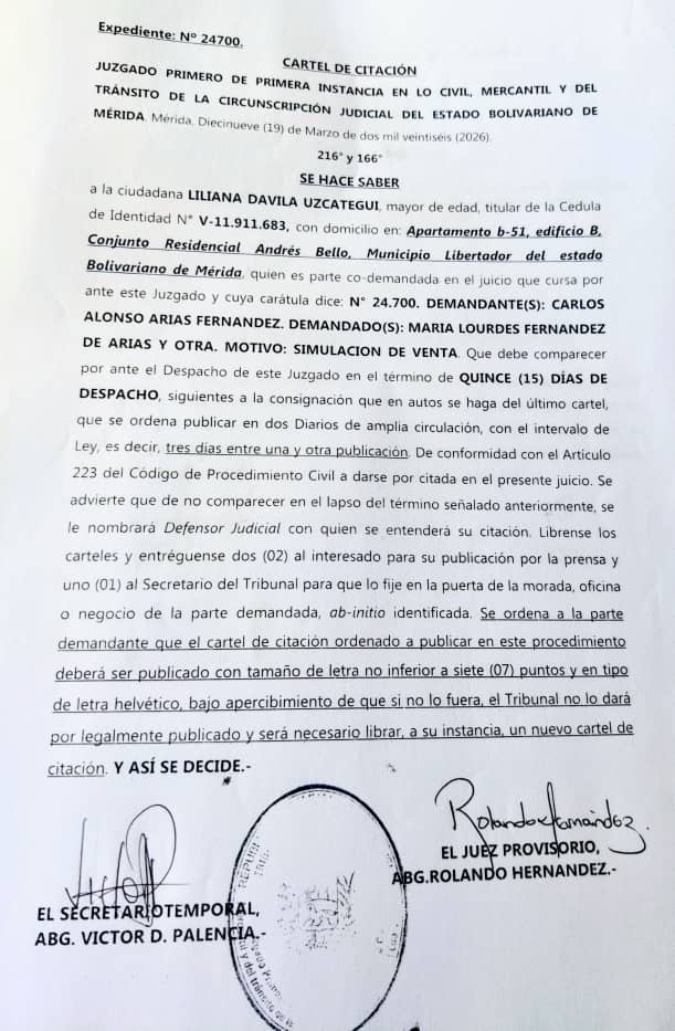 8 lo 0 comentarios 0 FacebookTwitterPinterestEmail Redacción web publicación anterior Detenido un hombre por golpear a su hijo porque «lo poncharon» en un juego de béisbol de la Pequeña Liga Coquivacoa publicación siguiente Cartel de citación a la ciudadana KEYLA JAQUELINE QUINTERO SALAS, titular de la cédula de identidad Nº. V-11.224.235 Related Articles Se convoca a todos los propietarios del Conjunto... 14 de abril de 2026 Cartel de citación al ciudadano CARLOS GUSTAVO NAVARRO... 14 de abril de 2026 Cartel de citación a la ciudadana KEYLA JAQUELINE... 14 de abril de 2026 Convocatoria a Asamblea Extraordinaria de la Cooperativa de... 13 de abril de 2026 Cartel de citación al ciudadano JESÚS RAFAEL ÁVILA... 13 de abril de 2026 Cartel de citación al ciudadano JOSÉ REINALDO PARRA... 13 de abril de 2026 EDICTO SE HACE SABER: Que el ciudadano JOSE... 13 de abril de 2026 EDICTO. Se hace saber a los HEREDEROS DESCONOCIDOS... 12 de abril de 2026 CARTEL DE CITACION HACE SABER A la SOCIEDAD... 11 de abril de 2026 Edicto de emplazamiento a los herederos desconocidos del... 10 de abril de 2026