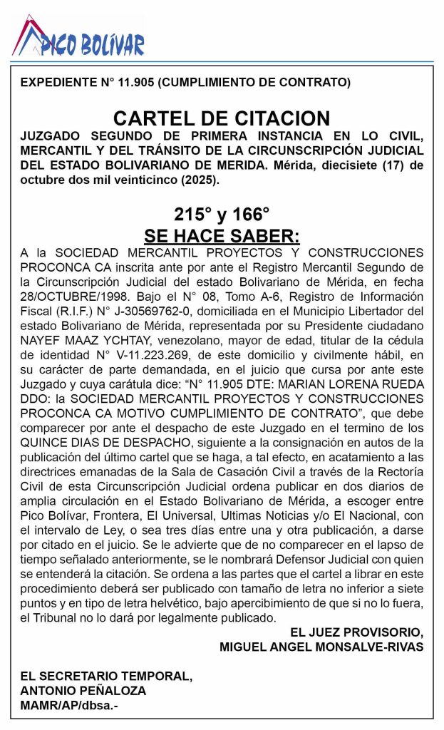 HomeAvisos LegalesCARTEL DE CITACIÓN a la Sociedad Mercantil Proyectos y Construcciones PROCONCA C.A., representada por su Presidente Nayef Maaz Ychtay, titular de la cédula de identidad N° V-11.223.269