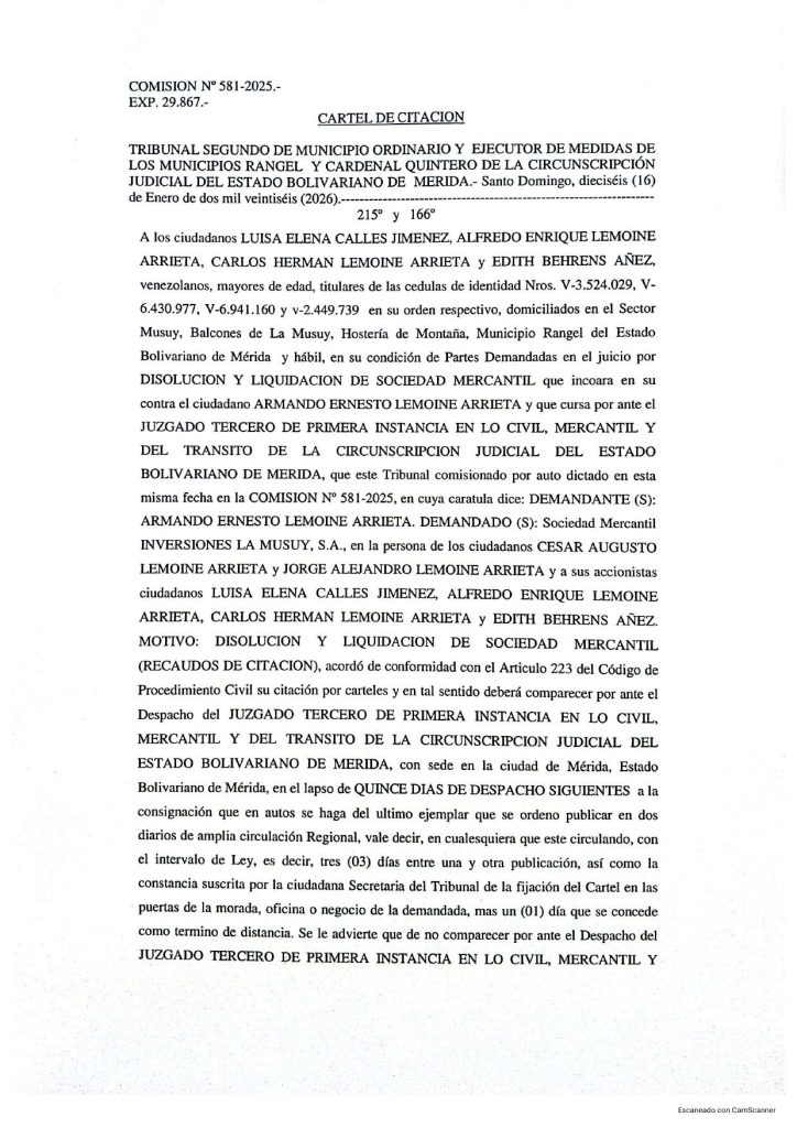 HomeAvisos LegalesCARTEL DE CITACION A los ciudadanos LUISA ELENA CALLES JIMENEZ, ALFREDO ENRIQUE LEMOINE ARRIETA, CARLOS HERMAN LEMOINE ARRIETA y EDITH BEHRENS AÑEZ, titulares de las cedulas de identidad Nros. V-3.524.029, V-6.430.977, V-6.941.160 y v-2.449.739 en su orden respectivo