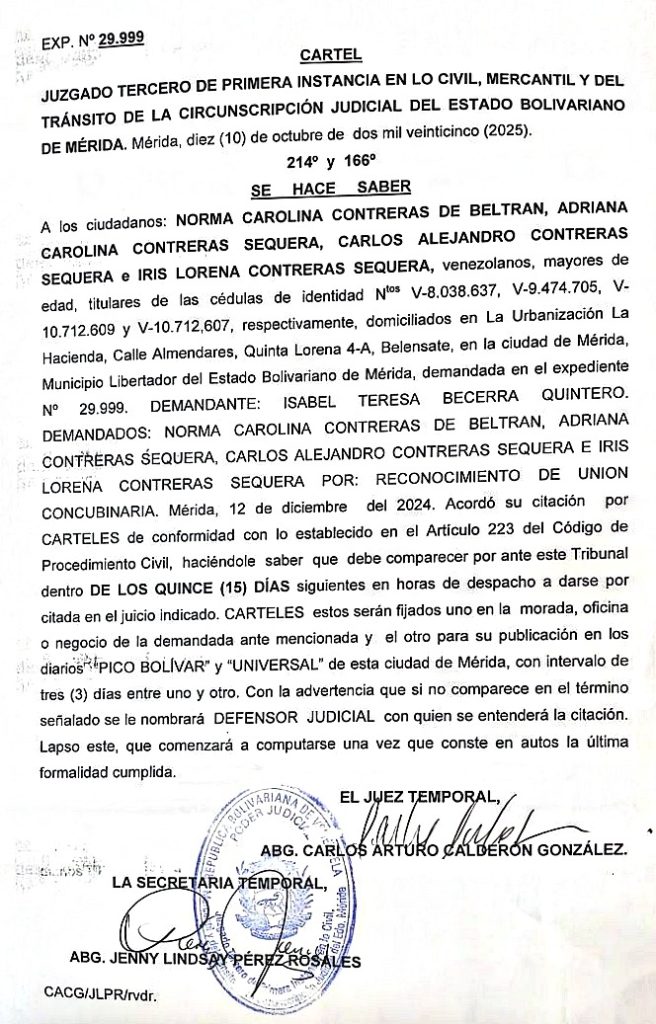 Home Avisos Legales Cartel de Citación A los ciudadanos Norma Carolina Contreras de Beltrán, CI  N° V-8.038.637; Adriana Carolina Contreras Sequera, CI N° V-9.474.705; Carlos Alejandro Contreras Sequera, CI N° V-10.712.609; e Iris Lorena Contreras Sequera, CI N° V-10.712.607