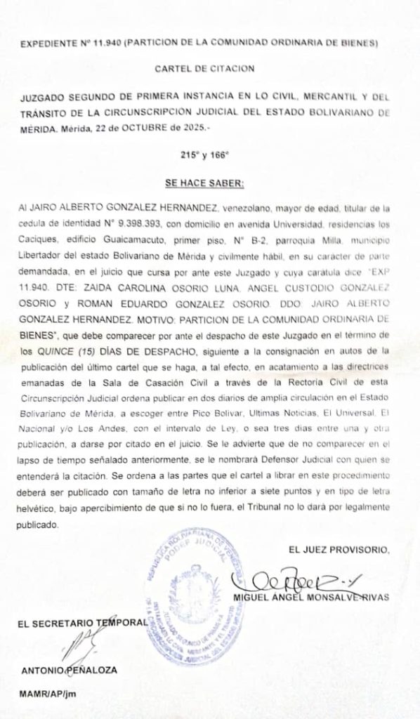 9 0 comentario 0 FacebookTwitterPinterestEmail Redacción web Seguir publicación anterior Padrino López: Jamás permitiremos que se instale un gobierno arrodillado a EE. UU. publicación siguiente Imputan por delitos de «odio» al médico merideño Pedro Fernández Related Articles CARTEL DE CITACIÓN Al ciudadano GUILFREDO BRICEÑO RIVAS, titular de la... 24 de octubre de 2025 Cartel de Citación A los ciudadanos Norma Carolina Contreras de... 24 de octubre de 2025 Tercera convocatoria a la Asamblea Ordinaria de Accionistas... 24 de octubre de 2025 Convocatoria Condominio Conjunto Residencial “El Manantial” Asamblea General... 24 de octubre de 2025 Edicto del Juzgado Tercero de Primera Instancia en... 23 de octubre de 2025 Edicto mediante el cual se hace saber a... 23 de octubre de 2025 Edicto, mediante el cual se hace saber a... 23 de octubre de 2025 CARTEL DE CITACION al ciudadano: EDGAR ALEXANDER SOTO... 23 de octubre de 2025 Notificación de disolución de unión estable de hecho... 22 de octubre de 2025 CARTEL DE CITACION Al ciudadano: LUIS AUGUSTO CHACIN... 22 de octubre de 2025