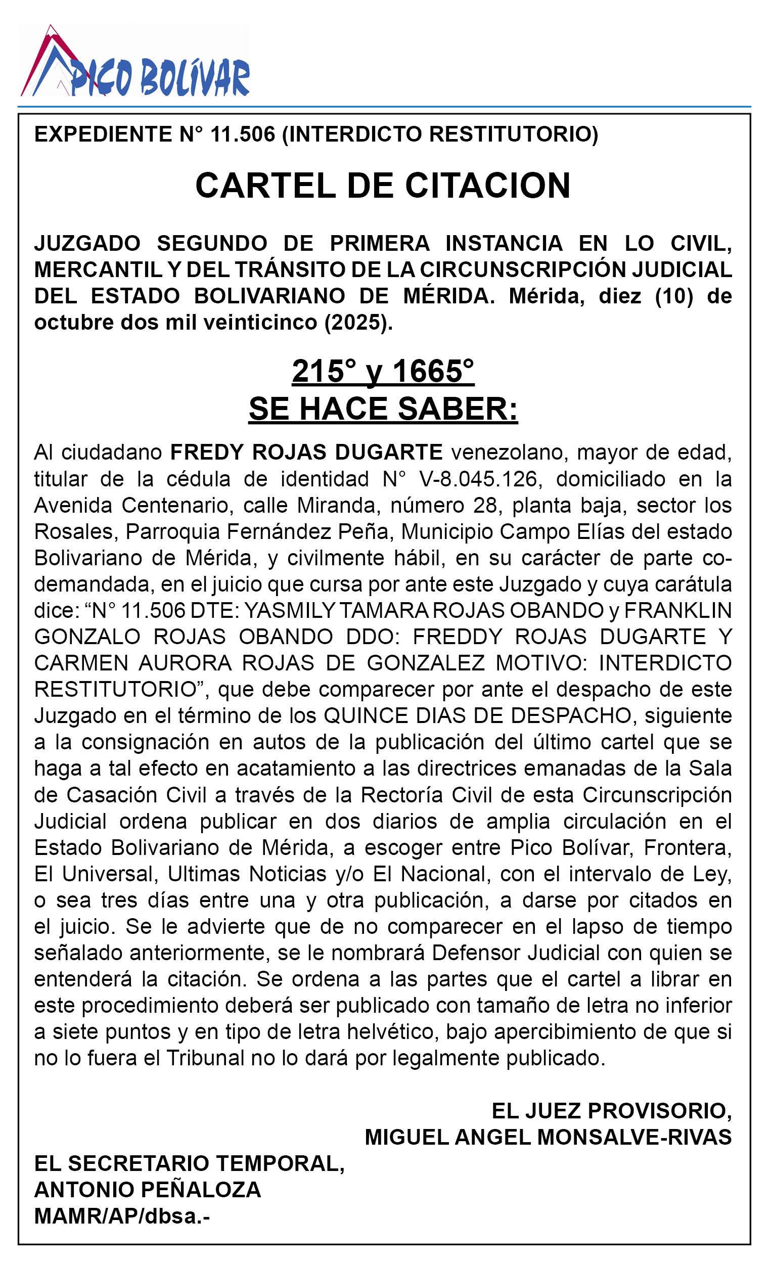 17 0 comentarios 0 FacebookTwitterPinterestEmail Redacción web publicación anterior Cartel de Citación a la ciudadana CARMEN AURORA ROJAS DE GONZALEZ, titular de la cédula de identidad N° V-10.714.126 publicación siguiente CARTEL DE CITACIÓN Al ciudadano ADELXO ROJAS ROJAS, titular de la Cedula de Identidad N° V-11.957.923 Related Articles Convocatoria a Asamblea General de Propietarios Condominio “Residencias... 25 de noviembre de 2025 Él Impreso Avisos Legales 25 de noviembre de 2025 PRESCRIPCIÓN ADQUISITIVA – EDICTO Se hace saber que... 24 de noviembre de 2025 SE HACE SABER: A la ciudadana PAOLA PATRICIA... 24 de noviembre de 2025 EDICTO Se hace saber a los herederos desconocidos del... 24 de noviembre de 2025 CARTEL DE NOTIFICACIÓN A la Ciudadana ANYOLINY DEL... 23 de noviembre de 2025 Tribunal Quinto de Municipio Ordinario y Ejecutor de... 23 de noviembre de 2025 CARTEL DE CITACIÓN Al ciudadano ADELXO ROJAS ROJAS,... 22 de noviembre de 2025 Cartel de Citación a la ciudadana CARMEN AURORA... 22 de noviembre de 2025 Cartel de citación a la ciudadana MARIA MATILDE... 22 de noviembre de 2025
