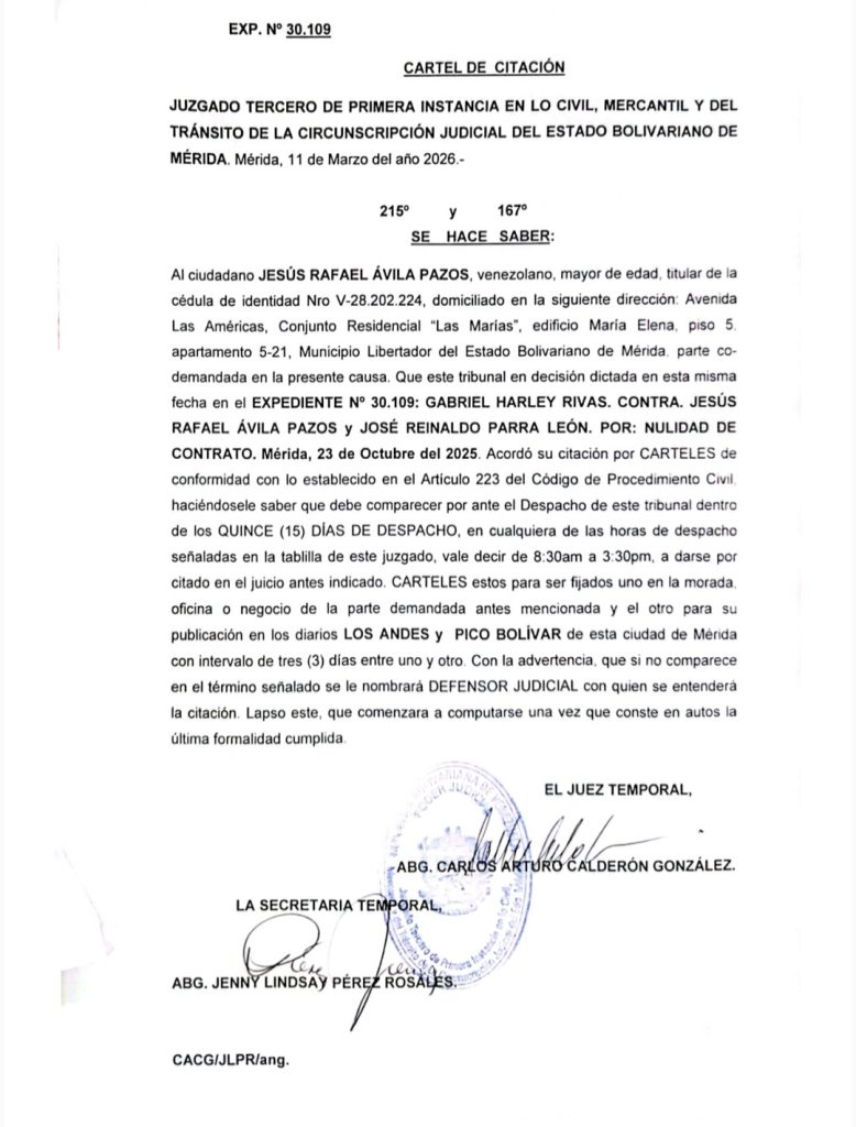 17 0 comentarios 0 FacebookTwitterPinterestEmail Redacción web publicación anterior Cartel de citación al ciudadano JOSÉ REINALDO PARRA LEÓN, titular de la cédula de identidad Nº. V-8.026.477 publicación siguiente Dos lesionados por caída en moto en Santa Barbara Related Articles Convocatoria a Asamblea General Ordinaria de Copropietarios de... 15 de abril de 2026 Edicto: Llamado a Interesados y Posibles Herederos del... 15 de abril de 2026 CARTEL DE CITACION HACE SABER Al ciudadano WILLIAM... 15 de abril de 2026 Anuncio: Primer Cartel de Venta en Pública Subasta... 15 de abril de 2026 Se convoca a todos los propietarios del Conjunto... 14 de abril de 2026 Cartel de citación al ciudadano CARLOS GUSTAVO NAVARRO... 14 de abril de 2026 Cartel de citación a la ciudadana KEYLA JAQUELINE... 14 de abril de 2026 Cartel de citación a la ciudadana LILIANA DAVILA... 14 de abril de 2026 Convocatoria a Asamblea Extraordinaria de la Cooperativa de... 13 de abril de 2026 Cartel de citación al ciudadano JOSÉ REINALDO PARRA... 13 de abril de 2026