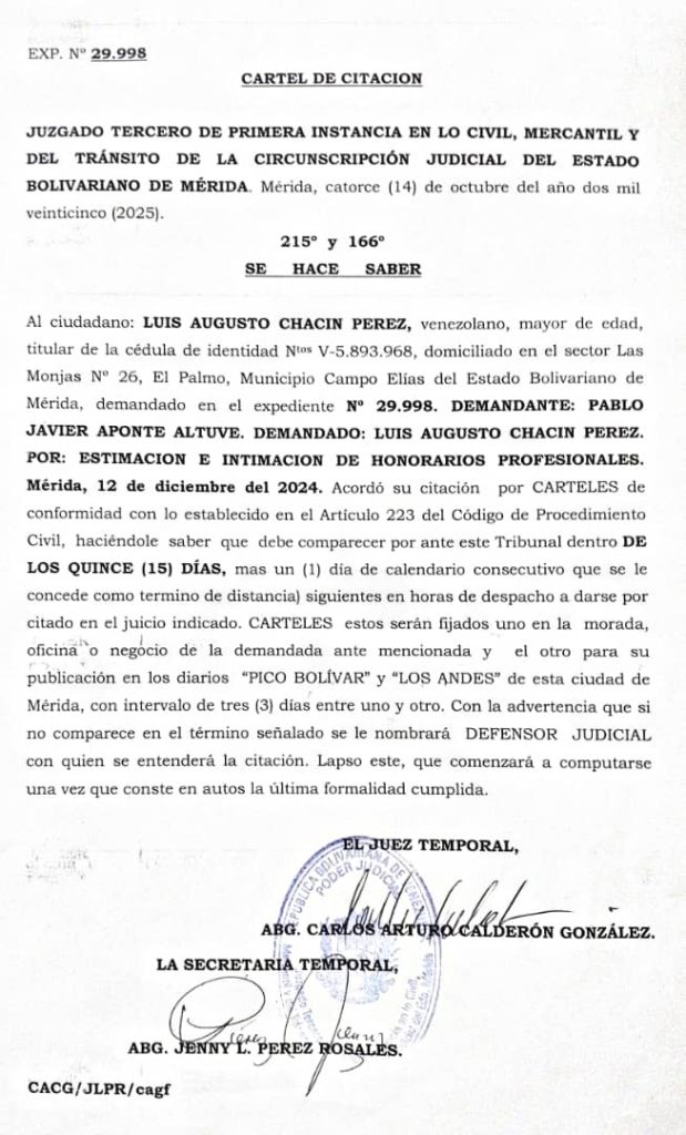 20 0 comentario 0 FacebookTwitterPinterestEmail Redacción web Seguir publicación anterior Acciones encubiertas de EE.UU. «violan la soberanía de Venezuela», según expertos de la ONU publicación siguiente Maduro pide crear aplicación para que la gente reporte «todo lo que ve, todo lo que oye» Related Articles CARTEL DE CITACION AI ciudadano JAIRO ALBERTO GONZALEZ... 25 de octubre de 2025 CARTEL DE CITACIÓN Al ciudadano GUILFREDO BRICEÑO RIVAS, titular de la... 24 de octubre de 2025 Cartel de Citación A los ciudadanos Norma Carolina Contreras de... 24 de octubre de 2025 Tercera convocatoria a la Asamblea Ordinaria de Accionistas... 24 de octubre de 2025 Convocatoria Condominio Conjunto Residencial “El Manantial” Asamblea General... 24 de octubre de 2025 Edicto del Juzgado Tercero de Primera Instancia en... 23 de octubre de 2025 Edicto mediante el cual se hace saber a... 23 de octubre de 2025 Edicto, mediante el cual se hace saber a... 23 de octubre de 2025 CARTEL DE CITACION al ciudadano: EDGAR ALEXANDER SOTO... 23 de octubre de 2025 Notificación de disolución de unión estable de hecho... 22 de octubre de 2025
