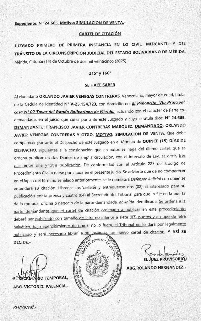 20 0 comentario 0 FacebookTwitterPinterestEmail Redacción web Seguir publicación anterior *Alcalde Nelson Álvarez anunció directivas de Ferisol y Comisión Taurina 2026* publicación siguiente CARTEL DE NOTIFICACIÓN al Ciudadano ALEXANDER JOSÉ MIERES CAÑIZALES, itular de la cócula de identidad número 19.467.843 Related Articles CARTEL DE CITACIÓN Al ciudadano: JOSE LUIS MONCAYO... 18 de octubre de 2025 Cartel de Citación a la ciudadana, BLANCA MAYIRA... 17 de octubre de 2025 CARTEL DE NOTIFICACIÓN al Ciudadano ALEXANDER JOSÉ MIERES... 17 de octubre de 2025 CARTEL DE CITACIÓN Al ciudadano: JOSE LUIS MONCAYO DELGADO,... 14 de octubre de 2025 Notificación de Disolución de Unión Estable de Hecho 14 de octubre de 2025 Cartel de Citación a la ciudadana Blanca Mayira Moreno Gamez,... 13 de octubre de 2025 CARTEL DE NOTIFICACIÓN Al ciudadano RICHARD MORALES, titular... 11 de octubre de 2025 Cartel de notificación oficial — Circunscripción Judicial del... 10 de octubre de 2025 Latil Auto S.A. | Convocatoria a la Asamblea... 10 de octubre de 2025 Convocatoria a Asamblea General Ordinaria de Copropietarios del... 10 de octubre de 2025