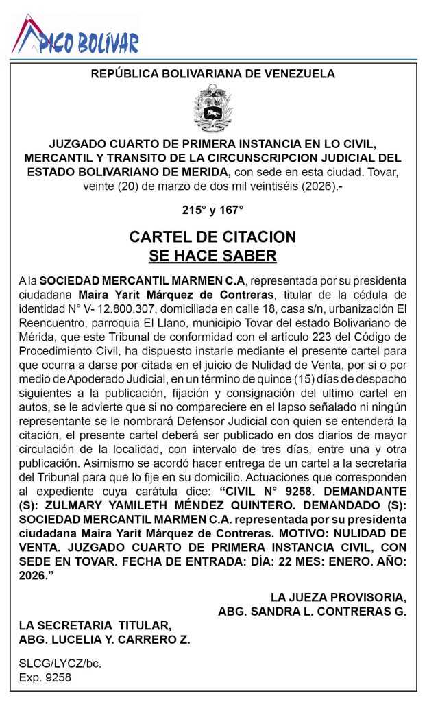 HomeAvisos LegalesCARTEL DE CITACION HACE SABER A la SOCIEDAD MERCANTIL MARMEN C.A, representada por su presidenta Maira Yarit Márquez de Contreras, cédula de identidad N° V- 12.800.307
