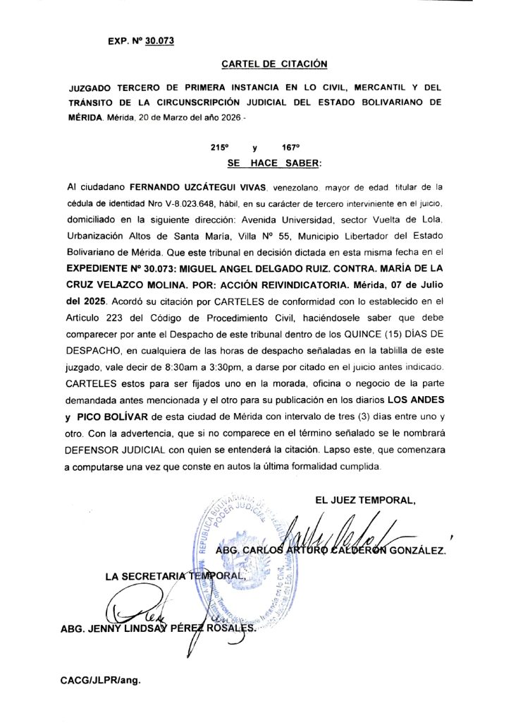 3 0 comentarios 0 FacebookTwitterPinterestEmail Redacción web publicación anterior EE. UU. redefine su “mapa de seguridad” e incluye a Venezuela en la “Gran Norteamérica” publicación siguiente Mérida reafirmó su fe en la XLI edición del Viacrucis de la Montaña Related Articles Edicto. Se hace saber a los HEREDEROS DESCONOCIDOS... 30 de marzo de 2026 Edicto de emplazamiento a los herederos desconocidos del... 27 de marzo de 2026 EDICTO. Se hace saber a los HEREDEROS DESCONOCIDOS... 27 de marzo de 2026 CARTEL DE CITACION HACE SABER: A la ciudadana... 26 de marzo de 2026 CARTEL DE CITACION HACE SABER: A los ciudadanos... 26 de marzo de 2026 Notificación de Disolución de la Unión Estable de... 26 de marzo de 2026 Edicto: Se hace saber a todas aquellas personas... 25 de marzo de 2026 EDICTO. Se hace saber A los HEREDEROS DESCONOCIDOS... 24 de marzo de 2026 CARTEL DE CITACION HACE SABER Al ciudadano JOSÉ... 24 de marzo de 2026 Edicto mediante el cual se hace saber a... 23 de marzo de 2026