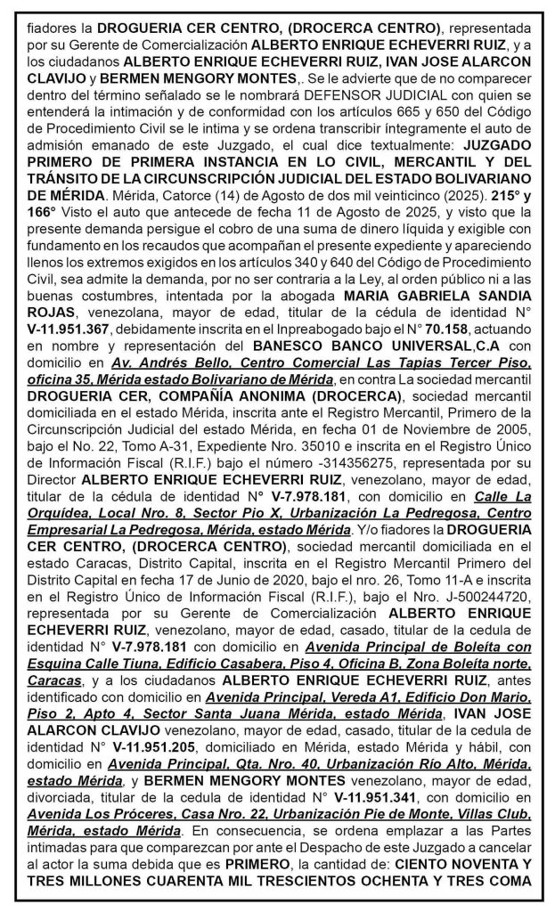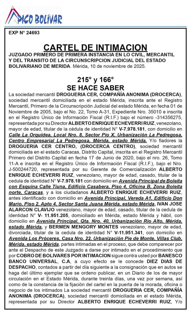 HomeAvisos LegalesCARTEL DE INTIMACION a La sociedad mercantil DROGUERIA CER, COMPAÑÍA ANONIMA (DROCERCA), sociedad mercantil representada por su Director ALBERTO ENRIQUE ECHEVERRI RUIZ, titular de la cédula de identidad N° V-7.978.181