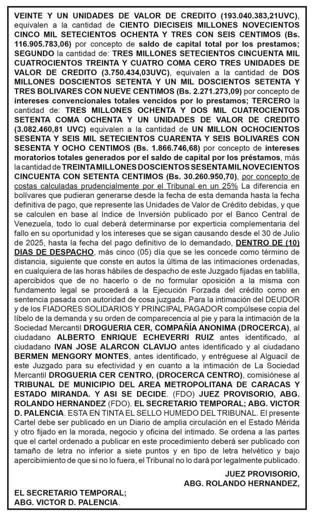 CARTEL DE INTIMACION a La sociedad mercantil DROGUERIA CER, COMPAÑÍA ANONIMA (DROCERCA), sociedad mercantil representada por su Director ALBERTO ENRIQUE ECHEVERRI RUIZ, titular de la cédula de identidad N° V-7.978.181