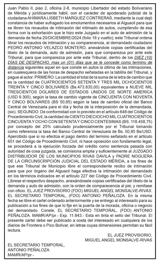 22 0 comentarios 0 FacebookTwitterPinterestEmail Redacción web publicación anterior CARTEL DE CITACION al ciudadano: EDGAR ALEXANDER SOTO VERA, titular de la cédula de identidad N° V-13.097.429 publicación siguiente Trump dice que hablará en “un futuro no muy lejano” con Nicolás Maduro y que tiene «algo muy específico que decir» Related Articles Convocatoria a Asamblea General de Propietarios Condominio “Residencias... 25 de noviembre de 2025 Él Impreso Avisos Legales 25 de noviembre de 2025 PRESCRIPCIÓN ADQUISITIVA – EDICTO Se hace saber que... 24 de noviembre de 2025 SE HACE SABER: A la ciudadana PAOLA PATRICIA... 24 de noviembre de 2025 EDICTO Se hace saber a los herederos desconocidos del... 24 de noviembre de 2025 CARTEL DE NOTIFICACIÓN A la Ciudadana ANYOLINY DEL... 23 de noviembre de 2025 Tribunal Quinto de Municipio Ordinario y Ejecutor de... 23 de noviembre de 2025 CARTEL DE CITACIÓN Al ciudadano ADELXO ROJAS ROJAS,... 22 de noviembre de 2025 Cartel de Citación al ciudadano FREDY ROJAS DUGARTE,... 22 de noviembre de 2025 Cartel de Citación a la ciudadana CARMEN AURORA... 22 de noviembre de 2025