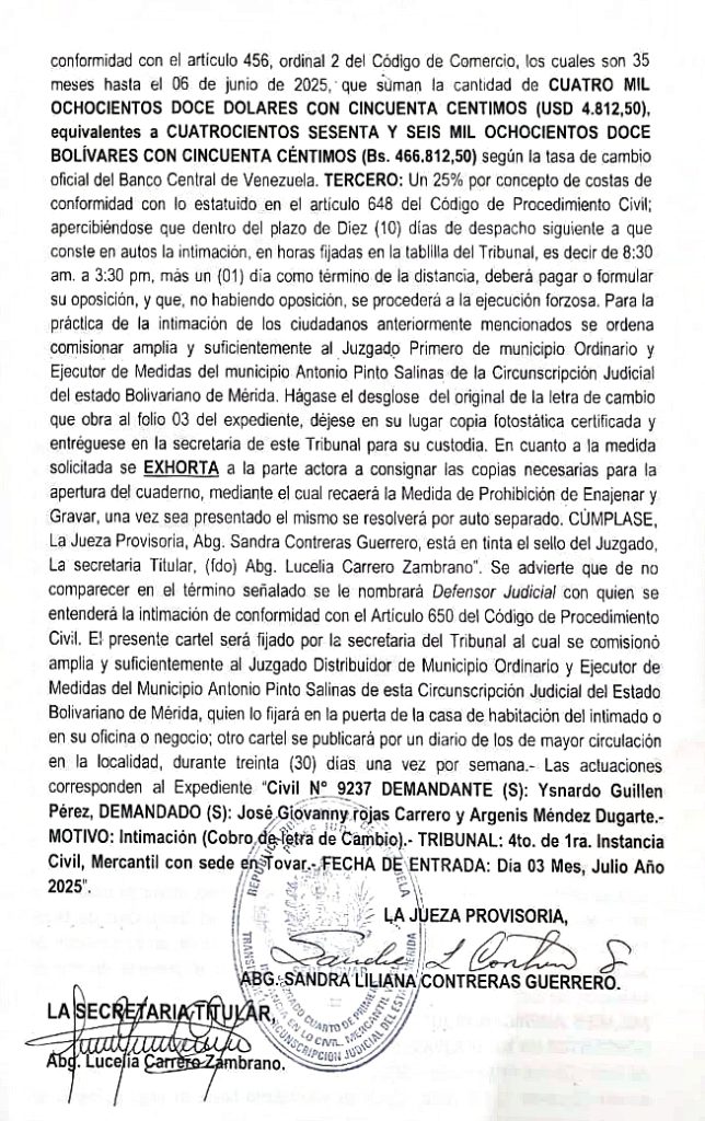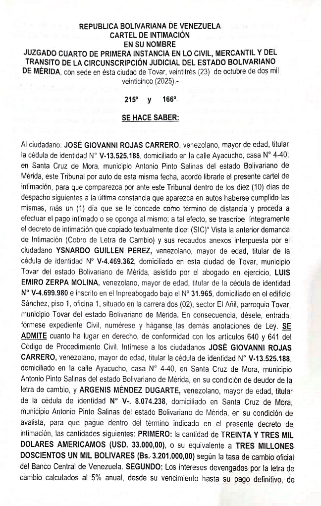 Avisos Legales Cartel de Intimación se hace saber: al ciudadano José Giovanni Rojas Carrero por Redacción web 30 de noviembre de 2025 escrito por Redacción web 30 de noviembre de 2025 15 0 comentarios 0 FacebookTwitterPinterestEmail Redacción web publicación anterior Padrino López: Defenderemos nuestra soberanía al costo que sea publicación siguiente Mecánico murió al ser arrollado por un motorizado en Los Curos Related Articles Cartel de notificación a todas las personas que pudieran resultar... 4 de diciembre de 2025 Convocatoria a la Asamblea Extraordinaria de Accionistas de... 4 de diciembre de 2025 CONVOCATORIA La Junta de Condominio del Edificio Las Terrazas... 3 de diciembre de 2025 EDICTO Se hace saber a los herederos desconocidos del... 1 de diciembre de 2025 SE HACE SABER: A la ciudadana PAOLA PATRICIA... 1 de diciembre de 2025 PRESCRIPCIÓN ADQUISITIVA – EDICTO Se hace saber que Dulce... 1 de diciembre de 2025 📢 ¡¡¡Atención Señores Copropietarios!!! Convocatoria Oficial a la Asamblea... 29 de noviembre de 2025 CARTEL DE INTIMACIÓN al ciudadano PEDRO ANTONIO VELAZCO... 29 de noviembre de 2025 Convocatoria Oficial para la Celebración de la Asamblea... 28 de noviembre de 2025 Tribunal Quinto de Municipio Ordinario y Ejecutor de... 27 de noviembre de 2025
