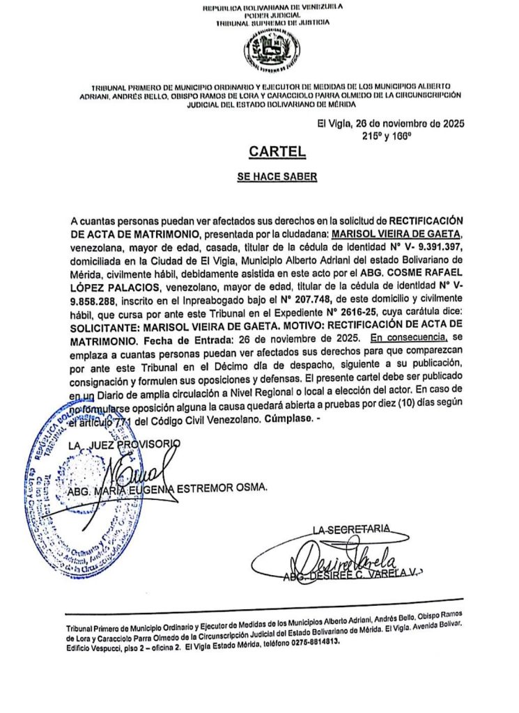 HomeAvisos LegalesCartel de notificación a todas las personas que pudieran resultar afectadas en sus derechos sobre la solicitud de rectificación de acta de matrimonio presentada por la ciudadana Marisol Vieira de Gaeta, titular de la cédula de identidad N° V- 9.391.397