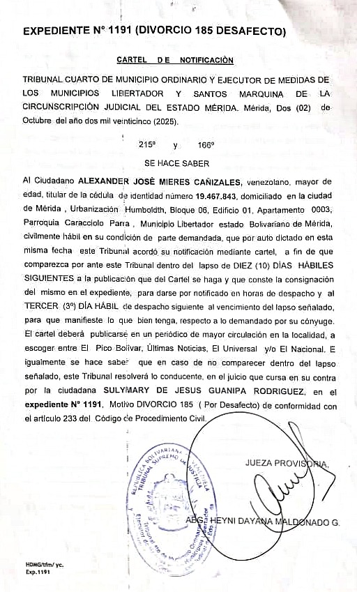 17 , 0 comentario 0 FacebookTwitterPinterestEmail Redacción web Seguir publicación anterior CARTEL DE CITACIÓN al ciudadano ORLANDO JAVIER VENEGAS CONTRERAS, titular de la Cedula de Identidad N° V-25.154.723 publicación siguiente El cuidado de la vida y la salud mental para una Mérida más humana Related Articles CARTEL DE CITACIÓN Al ciudadano: JOSE LUIS MONCAYO... 18 de octubre de 2025 Cartel de Citación a la ciudadana, BLANCA MAYIRA... 17 de octubre de 2025 CARTEL DE CITACIÓN al ciudadano ORLANDO JAVIER VENEGAS... 17 de octubre de 2025 CARTEL DE CITACIÓN Al ciudadano: JOSE LUIS MONCAYO DELGADO,... 14 de octubre de 2025 Notificación de Disolución de Unión Estable de Hecho 14 de octubre de 2025 Cartel de Citación a la ciudadana Blanca Mayira Moreno Gamez,... 13 de octubre de 2025 CARTEL DE NOTIFICACIÓN Al ciudadano RICHARD MORALES, titular... 11 de octubre de 2025 Cartel de notificación oficial — Circunscripción Judicial del... 10 de octubre de 2025 Latil Auto S.A. | Convocatoria a la Asamblea... 10 de octubre de 2025 Convocatoria a Asamblea General Ordinaria de Copropietarios del... 10 de octubre de 2025