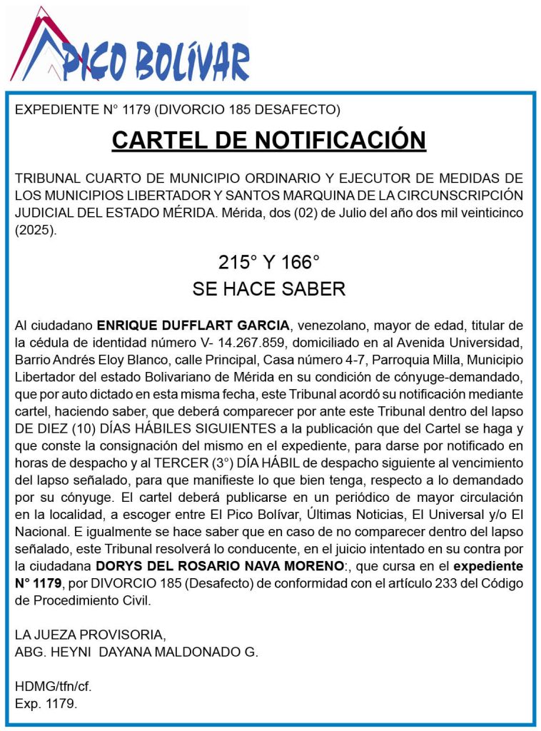 142 0 comentario 0 FacebookTwitterPinterestEmail Redacción web Seguir publicación anterior Cartel de citación al ciudadano MANUEL ALEJANDRO BARRIENTOS ARAQUE, titular de la cedula de identidad Nro. V-18.384.429 (04/07/2025) publicación siguiente Edicto sobre solicitud de reconocimiento de unión estable de hecho interpuesto por José de los Santos Ramírez Dávila contra María Teresa Avendaño Rondón en el expediente N° 11.482‑2025, convocatoria a las personas con interés directo en el asunto (05/07/2025) Related Articles CONVOCATORIA. Se convoca a todos los propietarios e inquilinos... 3 de octubre de 2025 Cartel de Notificación al Ciudadano Hugo Alfredo Fidalgo,... 2 de octubre de 2025 CONVOCATORIA –ASAMBLEA EXTRAORDINARIA DE COPROPIETARIOS Torre “D”, Conjunto... 1 de octubre de 2025 Se convoca a los copropietarios de la Torre B... 1 de octubre de 2025 Cartel de Citación al ciudadano: Guido Danilo Rincón Matos, mtitular... 30 de septiembre de 2025 Convocatoria a copropietarios de la Torre A del... 26 de septiembre de 2025 Cartel de Intimación al ciudadano Guillermo Antonio Moreno Raquín,... 26 de septiembre de 2025 Cartel de Citación a la ciudadana María de... 26 de septiembre de 2025 Cartel de Citación a la ciudadana Gregoria Medina Carrillo,... 25 de septiembre de 2025 Convocatoria a Asamblea Extraordinaria de Accionistas de Salud... 24 de septiembre de 2025