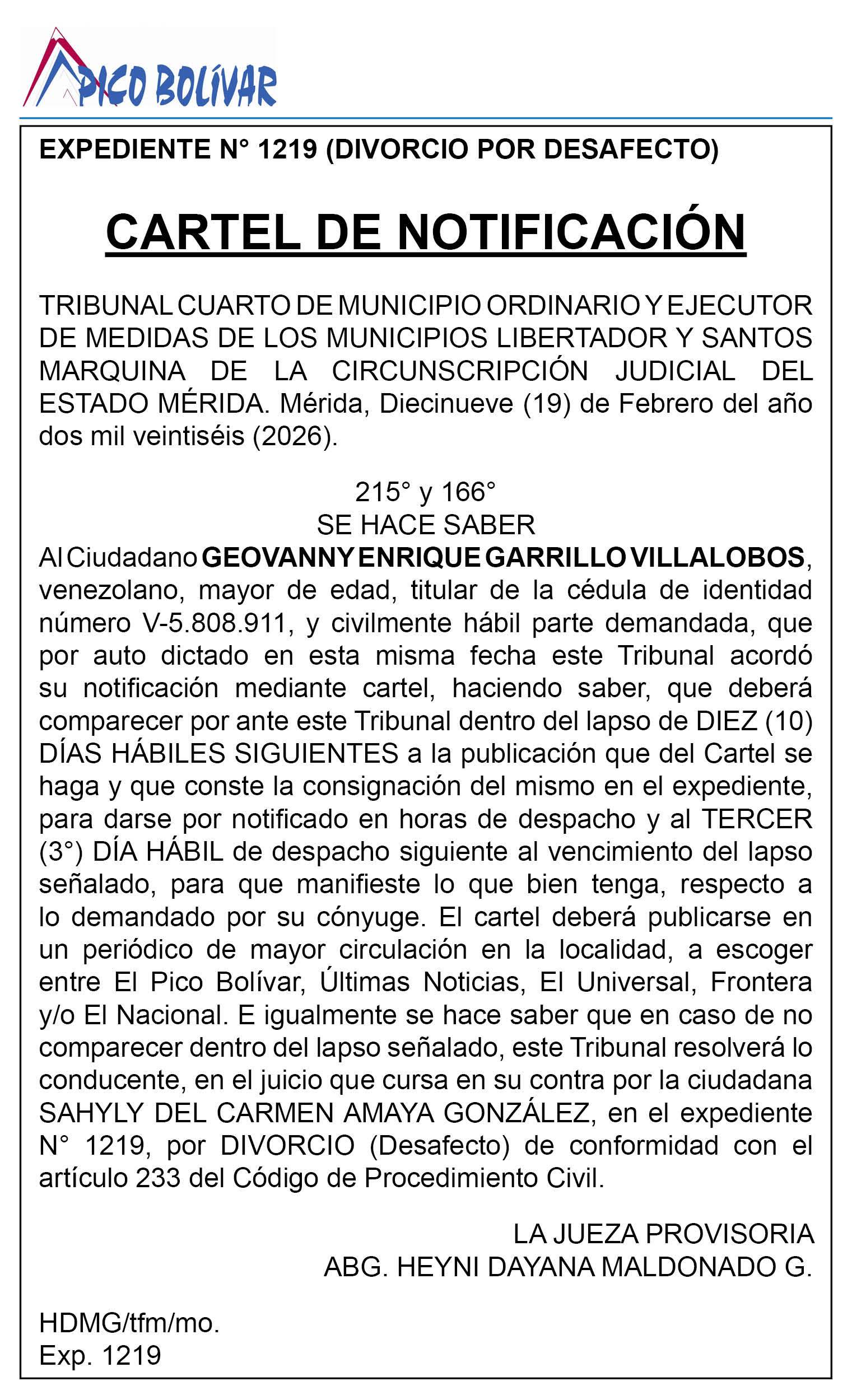 141 0 comentarios 0 FacebookTwitterPinterestEmail Redacción web publicación anterior CARTEL DE CITACIÓN HACE SABER: Al ciudadano EMIR HUMBERTO ANGULO HERNANDEZ, cédula de identidad N° V- 14.268.458 publicación siguiente Edicto. Se hace saber a los HEREDEROS DESCONOCIDOS DE LOS CAUSANTES FRANCISCO BRICEÑO PINO y MAURICIA DE BRICEÑO, titulares de las cédulas de identidad Nros V-661 517 y V-661 492 y a todas aquellas personas que se crean con derechos en el juicio de PRESCRIPCION ADQUISITIVA contra los HEREDEROS DESCONOCIDOS DE LOS CAUSANTES FRANCISCO BRICEÑO PINO Y MAURICIA DE BRICEÑO (23-02-2026) Related Articles Edicto: Se hace saber a todas aquellas personas... 8 de abril de 2026 Aviso de Convocatoria a Asamblea General Extraordinaria de... 8 de abril de 2026 CARTEL DE EMPLAZAMIENTO HACE SABER: A la ciudadana... 8 de abril de 2026 Edicto Se Hace Saber A Todas Aquellas Personas... 7 de abril de 2026 Él Impreso Avisos Legales 7 de abril de 2026 A.C. Mérida Country Club Convocatoria a Asamblea General... 7 de abril de 2026 Convocatoria de la Junta Directiva de Inversiones Sigma... 7 de abril de 2026 EDICTO Se hace saber a todas aquellas personas... 7 de abril de 2026 Cartel hace saber: Constitución de Hogar a favor... 7 de abril de 2026 EDICTO. Se hace saber A los HEREDEROS DESCONOCIDOS... 7 de abril de 2026