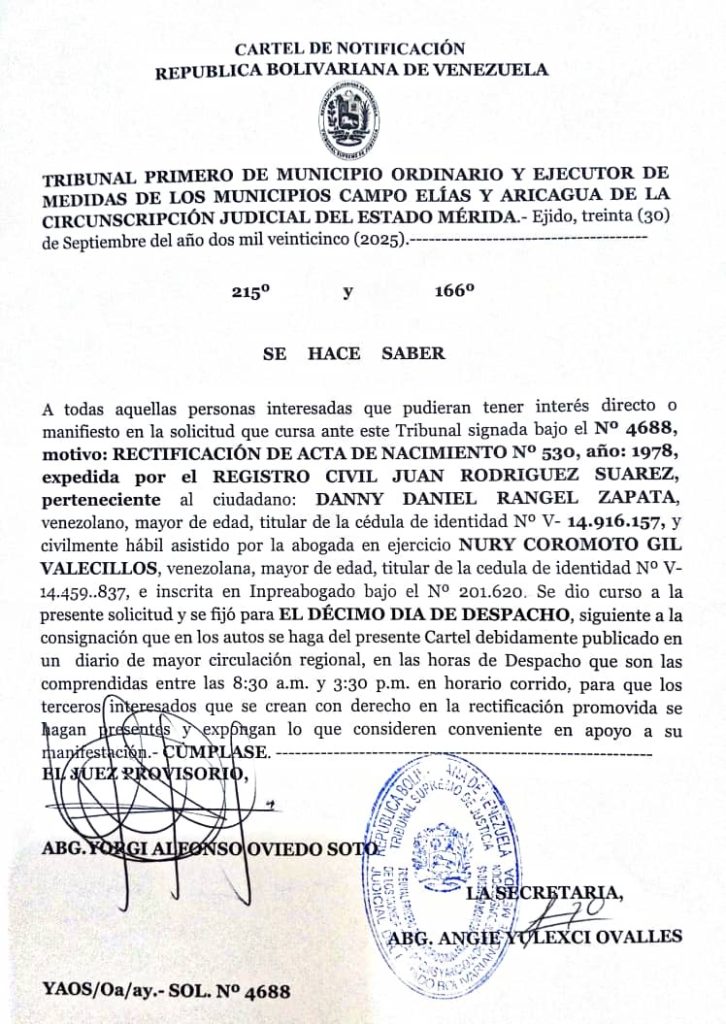 Cartel de notificación oficial — Circunscripción Judicial del Estado Mérida Tribunal Primero de Municipio Ordinario y Ejecutor de Medidas de los municipios Campo Elías y Aricagua Cartel de notificación oficial — Expediente N.° 4688 — Rectificación de acta de nacimiento N.° 530 (1978) Solicitante: Danny Daniel Rangel Zapata.(10-10-2025)