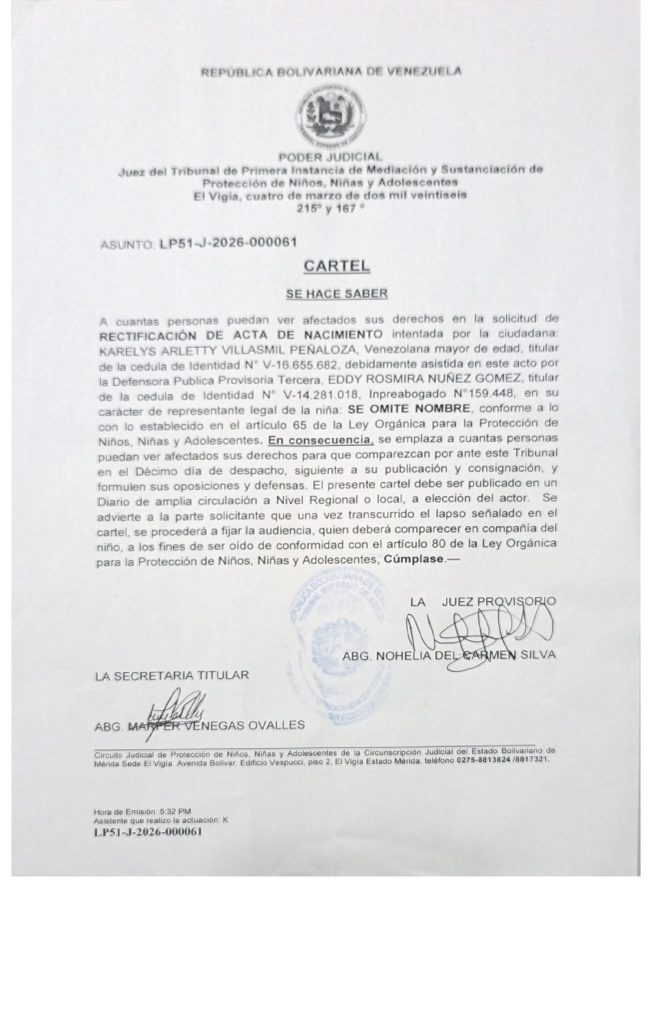 Cartel Se Hace Saber a cuantas personas puedan ver afectados sus derechos en la Solicitud de Rectificación de Acta de Nacimiento intentada por la Ciudadana Karelys Arletty Villasmil Peñaloza, Cédula de Identidad N° V-16.655.682