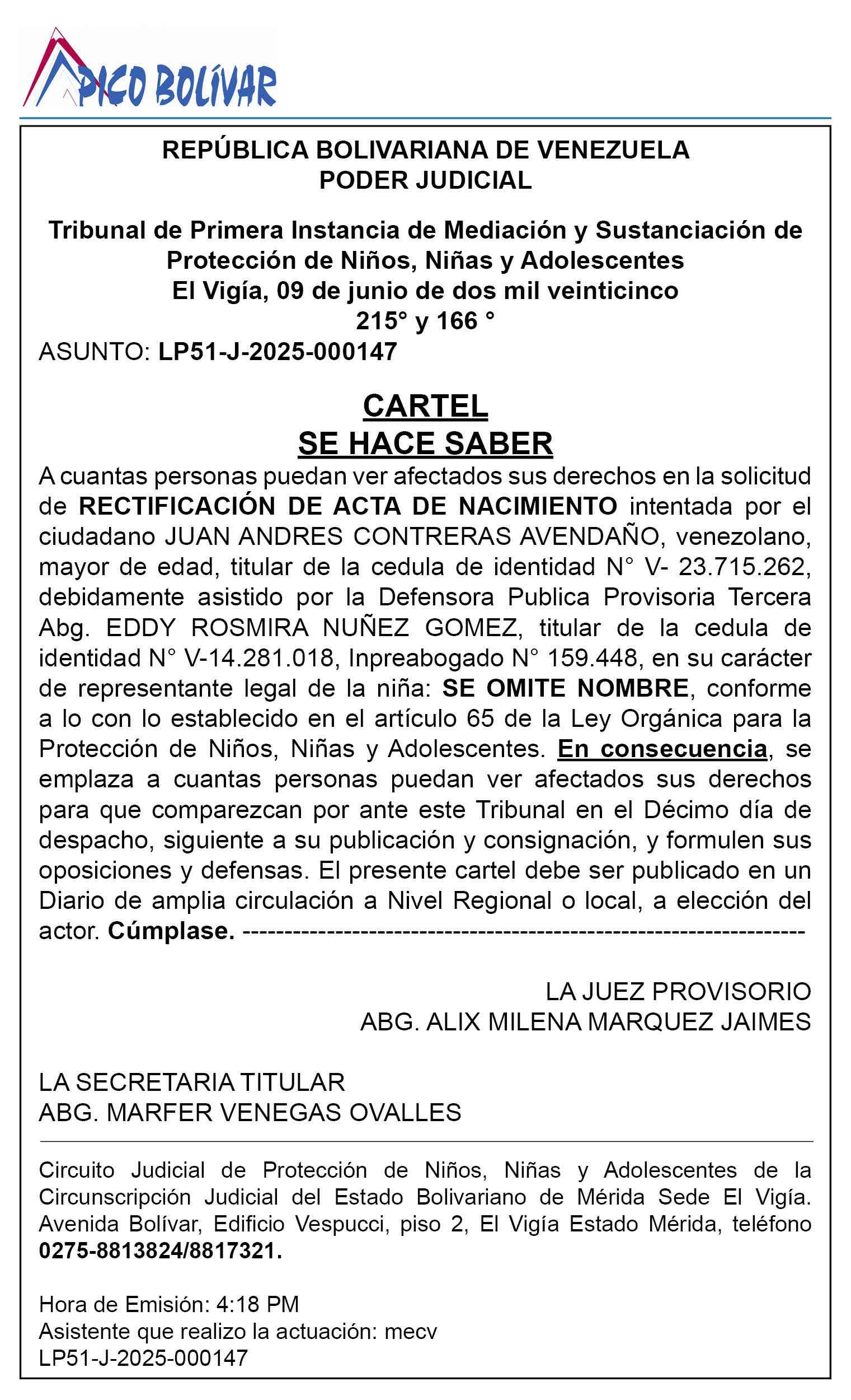 Cartel Se Hace Saber Solicitud de Rectificación de Acta de Nacimiento Promovida por el ciudadano Juan Andrés Contreras Avendaño En interés de Niño, Niña o Adolescente (LOPNNA)