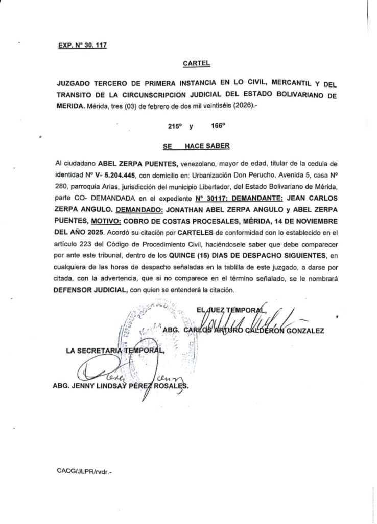9 0 comentarios 0 FacebookTwitterPinterestEmail Redacción web publicación anterior Trabajadores universitarios solicitan restablecimiento de tablas salariales publicación siguiente CARTEL DE CITACIÓN HACE SABER: A la ciudadana VALERIA PATRICIA MEDINA PALACIOS, titular de la cédula de identidad N° V- 27.241.250 Related Articles CARTEL DE INTIMACION HACE SABER: Al ciudadano ALI... 19 de febrero de 2026 CARTEL DE CITACIÓN HACE SABER: A la ciudadana... 19 de febrero de 2026 EDICTO HACE SABER A los HEREDEROS DESCONOCIDOS de... 17 de febrero de 2026 CARTEL DE CITACION: SE HACE SABER Al ciudadano... 17 de febrero de 2026 CONVOCATORIA A ASAMBLEA DE COPROPIETARIOS Conjunto Residencial Tinajeros... 17 de febrero de 2026 Edicto. Se hace saber a los HEREDEROS DESCONOCIDOS... 16 de febrero de 2026 EDICTO. Se hace saber a todas aquellas personas... 16 de febrero de 2026 CARTEL DE CITACIÓN SE HACE SABER: Al ciudadano:... 16 de febrero de 2026 EDICTO. Se hace saber a los HEREDEROS DESCONOCIDOS... 14 de febrero de 2026 Convocatoria a Asamblea General de Propietarios Condominio “Residencias... 12 de febrero de 2026