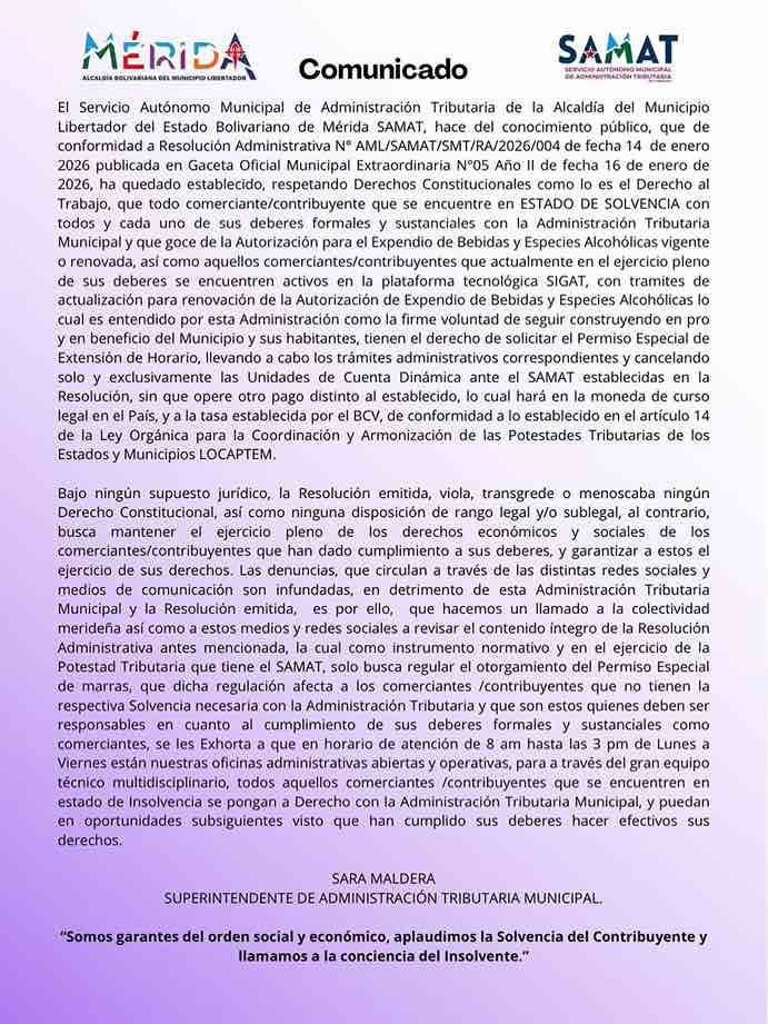 El SAMAT informa que los comerciantes y contribuyentes en estado de solvencia, con autorización vigente o en trámite para el expendio de bebidas y especies alcohólicas, pueden solicitar el Permiso Especial de Extensión de Horario, cumpliendo los procedimientos administrativos establecidos.