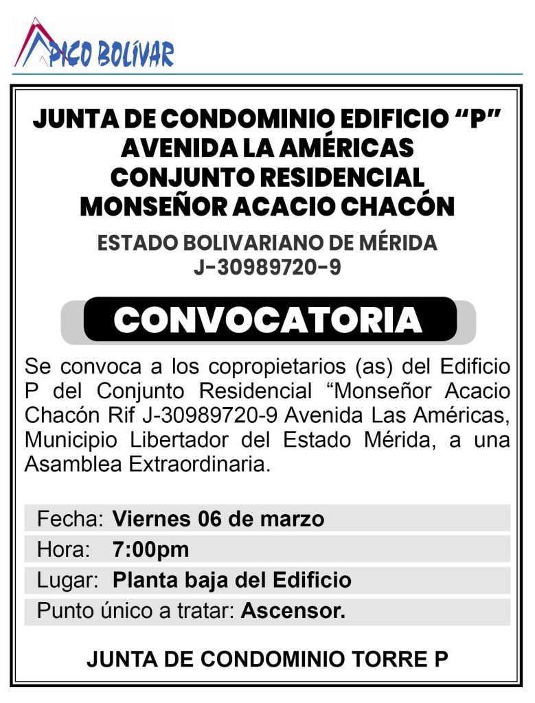 Convocatoria a Asamblea Extraordinaria de Copropietarios del Conjunto Residencial “Monseñor Acacio Chacón” – Edificio “P” – Viernes 06 de marzo – 7:00 p.m. – Planta baja del Edificio