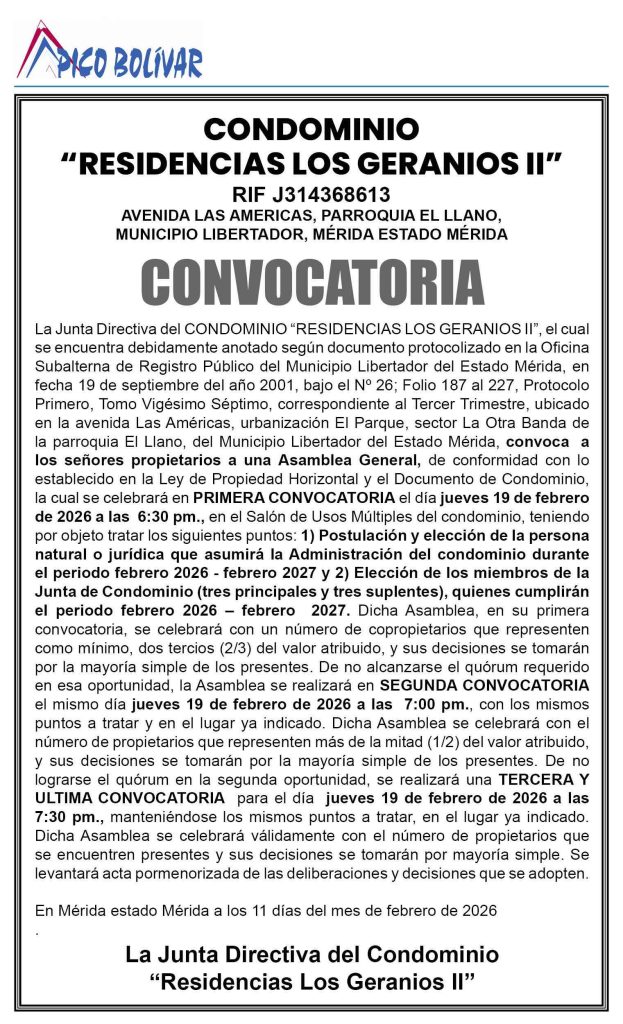 Home Avisos LegalesConvocatoria a Asamblea General de Propietarios Condominio “Residencias Los Geranios II” Jueves, 19 de febrero de 2026 Salón de Usos Múltiples del Condominio 📍