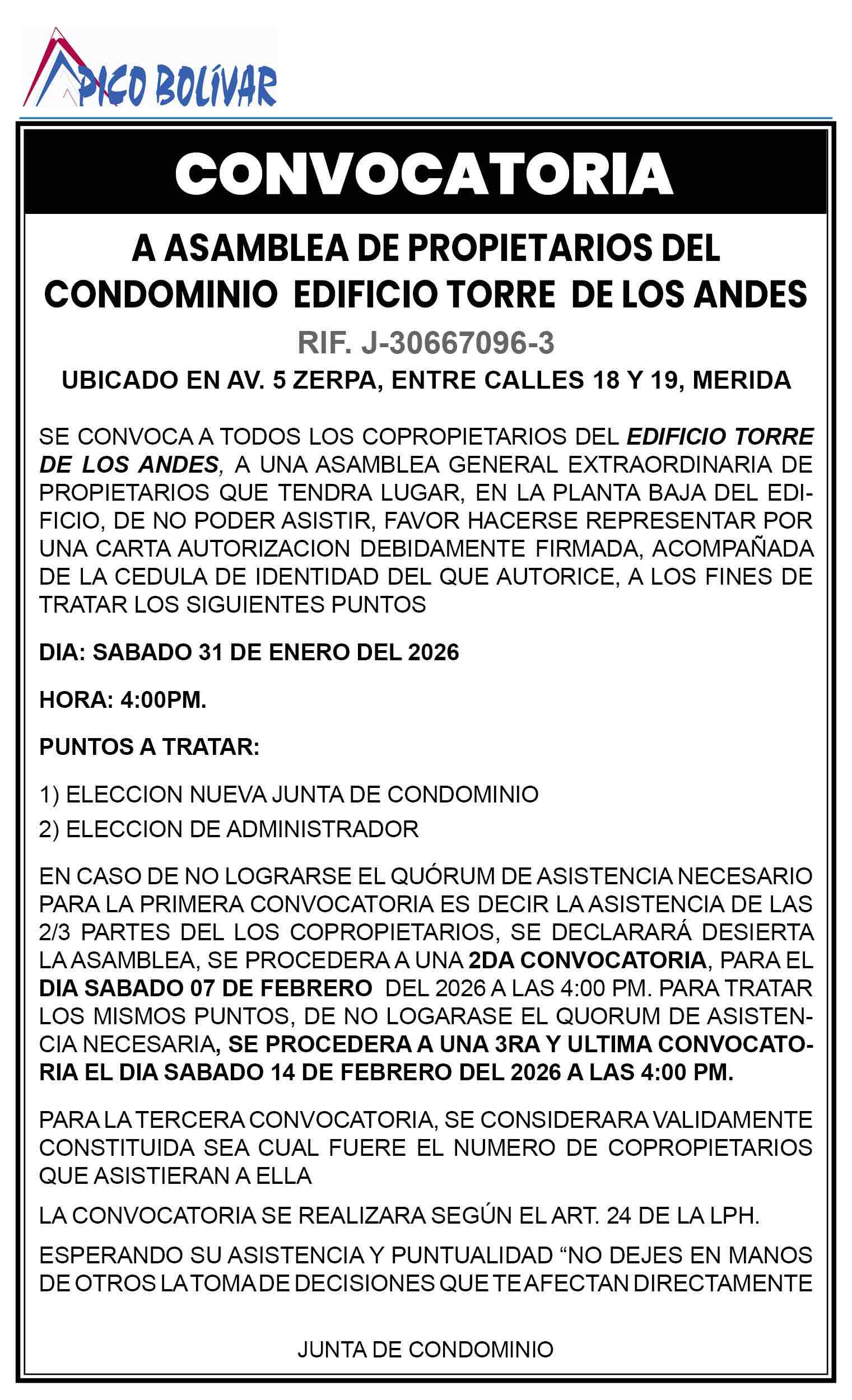 41 0 comentarios 0 FacebookTwitterPinterestEmail Redacción web publicación anterior Petro: EE. UU. debe “devolver” a Maduro para que sea juzgado en Venezuela publicación siguiente Segunda Convocatoria Asamblea Extraordinaria de Accionistas Valeri & Boada Compañía Anónima (VIBCA), C.A. – RIF J-090382437 Martes 03 de febrero de 2026 · 10:00 a.m. · C.C. El Solar, Local N° 06, Mérida Related Articles PICO BOLIVAR AVISOS LEGALES 9 de febrero de 2026 EDICTO. Se hace saber a todas aquellas personas... 9 de febrero de 2026 EDICTO. Se hace saber a los herederos conocidos... 9 de febrero de 2026 Edicto. Se hace saber a los HEREDEROS DESCONOCIDOS... 9 de febrero de 2026 CARTEL DE CITACION A los ciudadanos LUISA ELENA... 8 de febrero de 2026 Notificación de disolución de unión estable de hecho,... 7 de febrero de 2026 CARTEL DE CITACION HACE SABER:Al ciudadano JHONNY JOSE... 6 de febrero de 2026 CARTEL DE CITACION SE HACE SABER: Al ciudadano... 3 de febrero de 2026 CARTEL. SE HACE SABER A cuantas personas puedan... 3 de febrero de 2026 Convocatoria a Asamblea General Extraordinaria de la Asociación... 2 de febrero de 2026