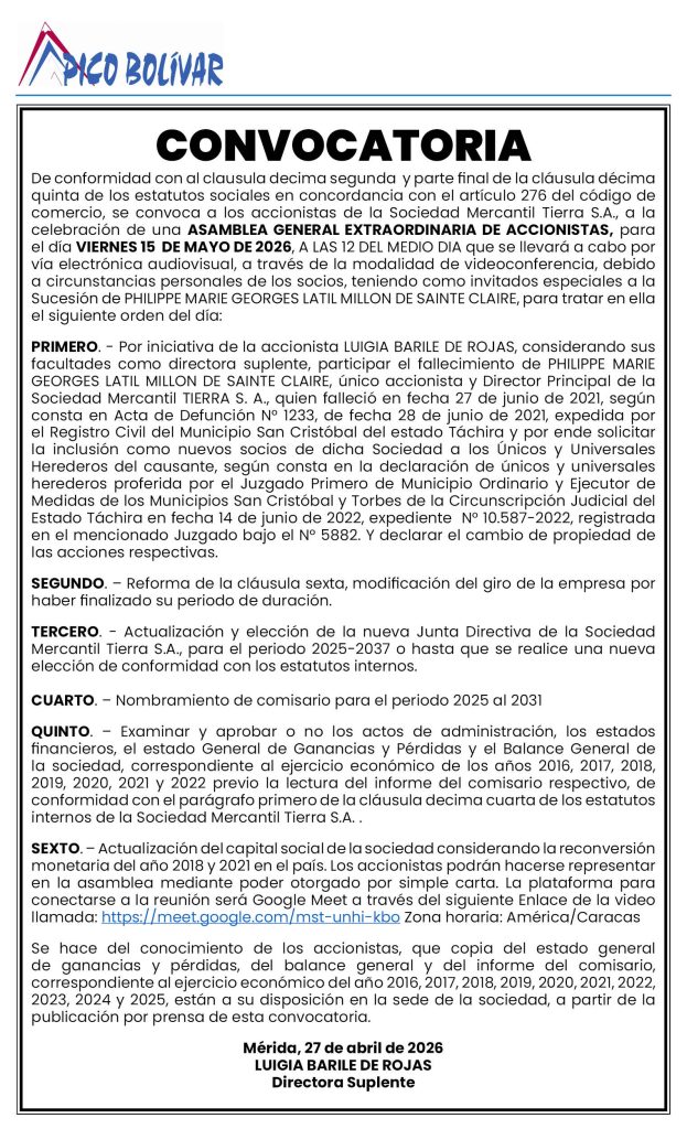 HomeAvisos LegalesConvocatoria a Asamblea General Extraordinaria de Accionistas de la Sociedad Mercantil Tierra S.A. para celebrarse el viernes 15 de mayo de 2026 a las 12 del mediodía mediante videoconferencia, a fin de tratar, elección de junta directiva, nombramiento de comisario, aprobación de estados financieros y actualización del capital social.