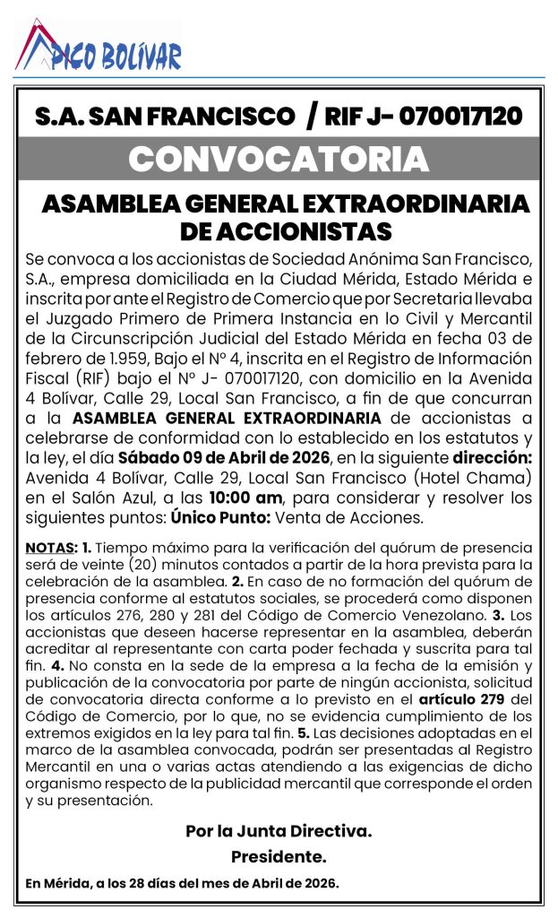 Home Avisos LegalesConvocatoria a Asamblea General Extraordinaria de Accionistas S.A. San Francisco a celebrarse el sábado 09 de abril de 2026 en el Salón Azul del Hotel Chama, Avenida 4 Bolívar, Calle 29, Local San Francisco, a las 10:00 a.m., con el único punto a tratar: Venta de acciones, conforme a los estatutos sociales y la ley.