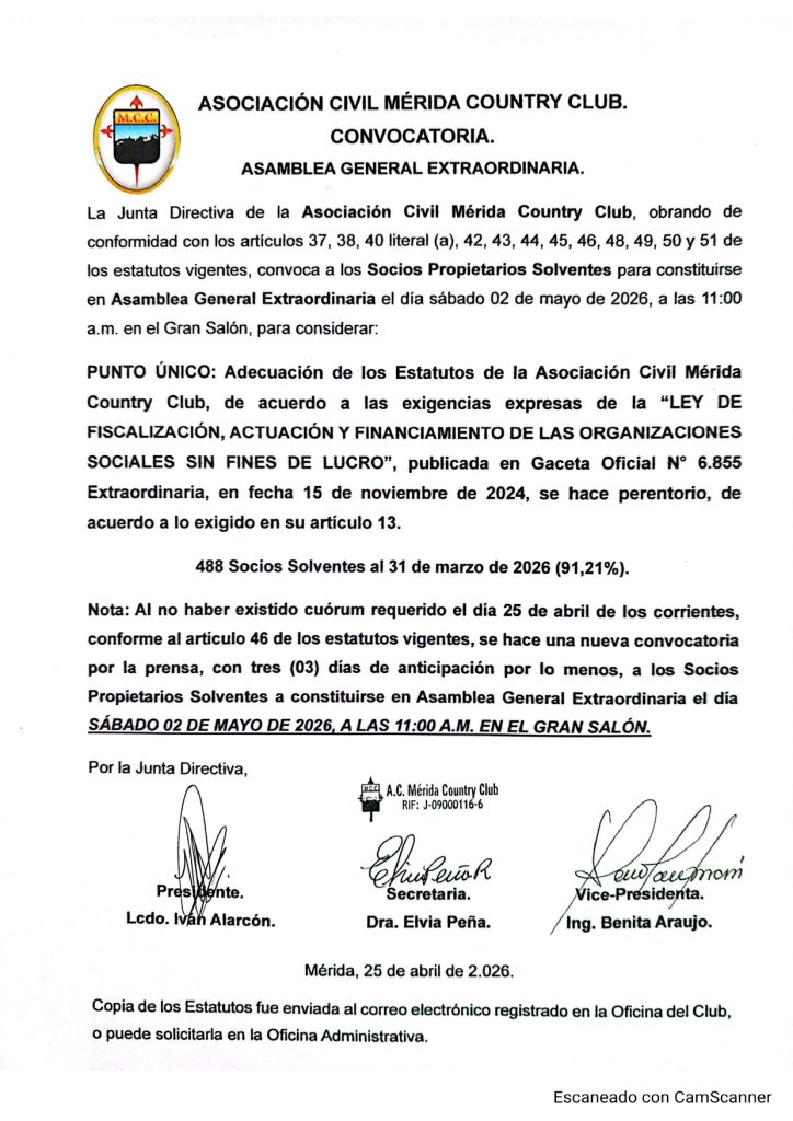 Convocatoria a Asamblea General Extraordinaria de la Asociación Civil Mérida Country Club, realizada por la Junta Directiva de conformidad con los estatutos vigentes, para celebrarse el sábado 02 de mayo de 2026 a las 11:00 a.m. en el Gran Salón