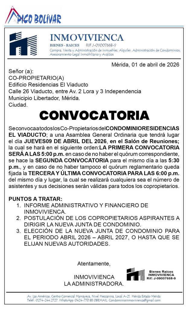 Home Avisos LegalesConvocatoria a Asamblea General Ordinaria de Copropietarios del Condominio Residencias El Viaducto para el jueves 09 de abril de 2026 con elección de nueva junta de condominio