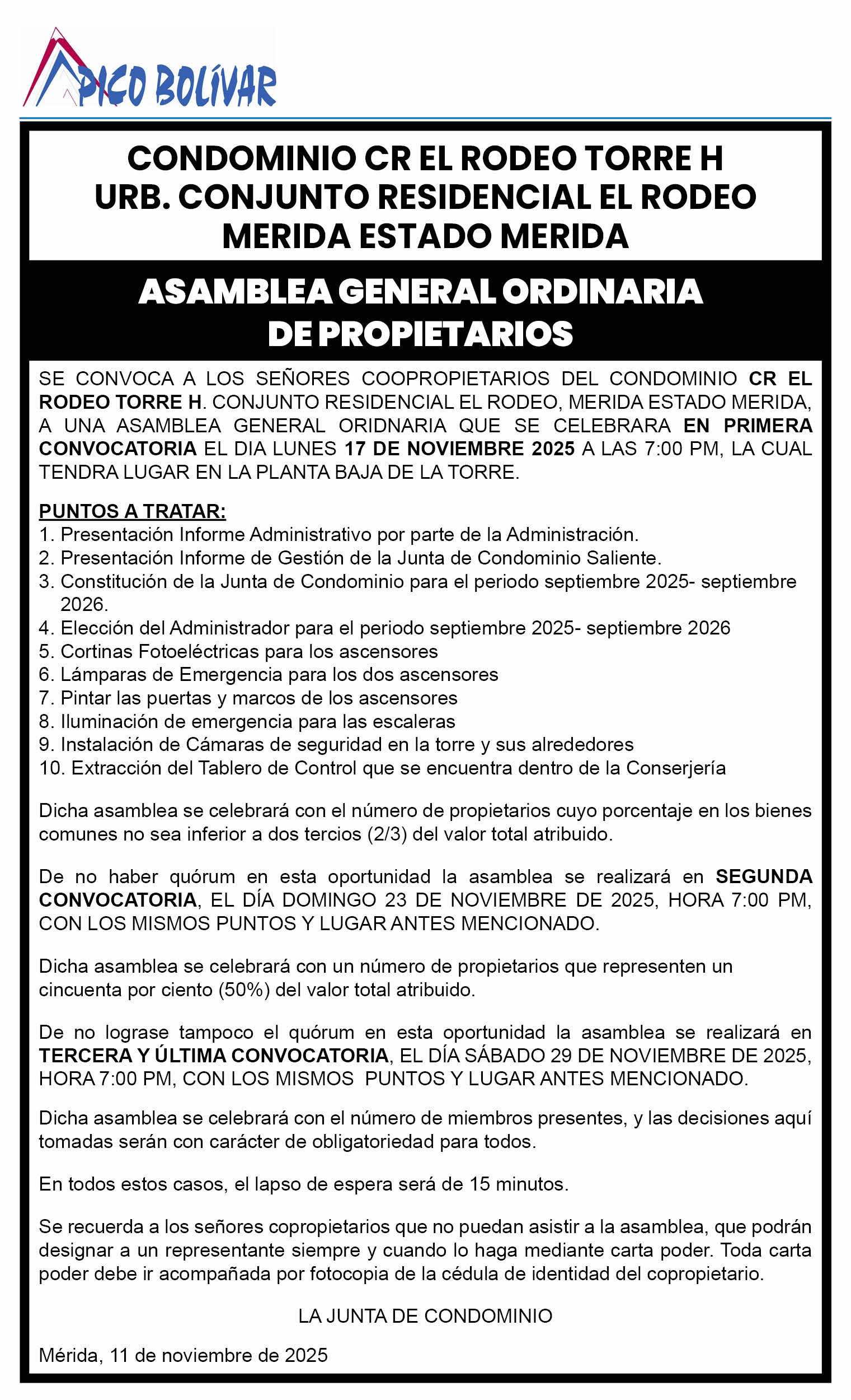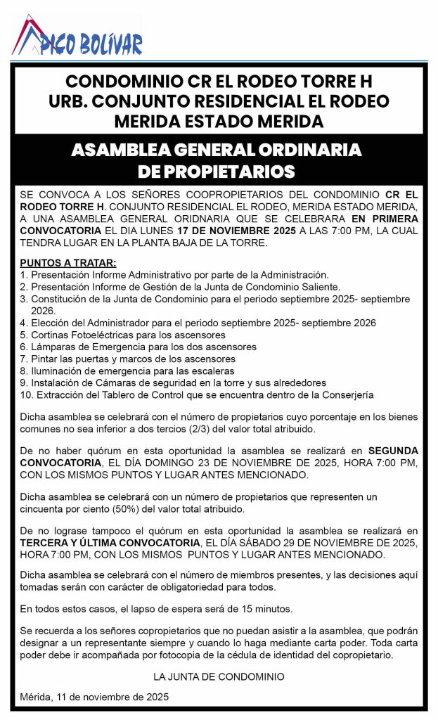 Convocatoria a Asamblea General Ordinaria de Propietarios del Condominio CR El Rodeo Torre H, Urb. Conjunto Residencial El Rodeo, Mérida – Estado Mérida