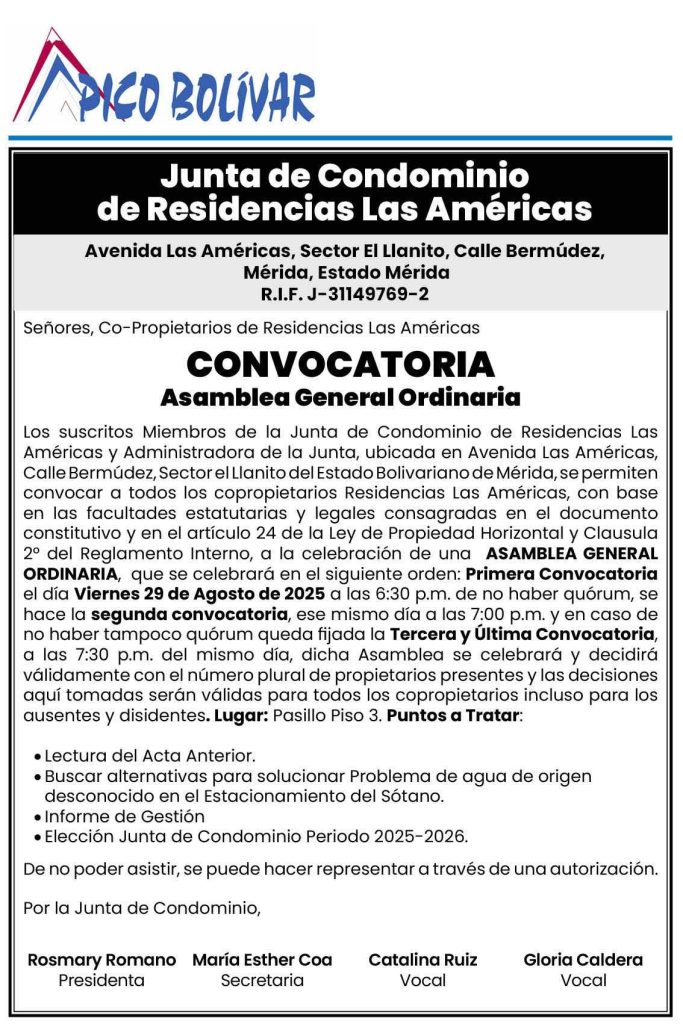 HomeAvisos LegalesConvocatoria a la Asamblea General Ordinaria de Copropietarios de Residencias Las Américas, a celebrarse el día viernes 29 de agosto de 2025, en el Pasillo del Piso 3, primera convocatoria a las 6:30 p.m., segunda a las 7:00 p.m. y tercera y última a las 7:30 p.m.
