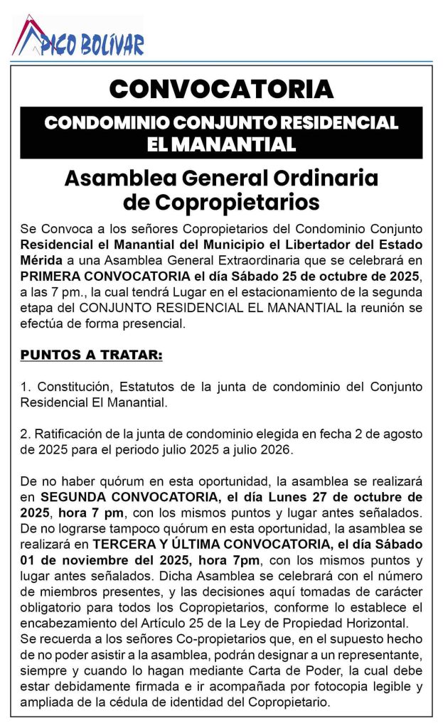 12 0 comentario 0 FacebookTwitterPinterestEmail Redacción web Seguir publicación anterior Gobierno de Mérida desplegó jornada social integral en Comuna Simón Bolívar publicación siguiente Tercera convocatoria a la Asamblea Ordinaria de Accionistas de la Sociedad Mercantil Auto Centro Andino, C.A. De la Junta Directiva de la Sociedad Mercantil Auto Centro Andino, C.A., para el accionista Gean Piero Antonio Pavone Guédez Related Articles CARTEL DE CITACION AI ciudadano JAIRO ALBERTO GONZALEZ... 25 de octubre de 2025 CARTEL DE CITACIÓN Al ciudadano GUILFREDO BRICEÑO RIVAS, titular de la... 24 de octubre de 2025 Cartel de Citación A los ciudadanos Norma Carolina Contreras de... 24 de octubre de 2025 Tercera convocatoria a la Asamblea Ordinaria de Accionistas... 24 de octubre de 2025 Edicto del Juzgado Tercero de Primera Instancia en... 23 de octubre de 2025 Edicto mediante el cual se hace saber a... 23 de octubre de 2025 Edicto, mediante el cual se hace saber a... 23 de octubre de 2025 CARTEL DE CITACION al ciudadano: EDGAR ALEXANDER SOTO... 23 de octubre de 2025 Notificación de disolución de unión estable de hecho... 22 de octubre de 2025 CARTEL DE CITACION Al ciudadano: LUIS AUGUSTO CHACIN... 22 de octubre de 2025