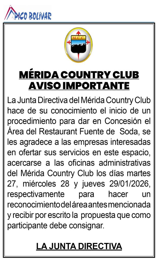 Aviso importante: convocatoria dirigida a empresas interesadas para la concesión del área de Restaurant – Fuente de Soda del Mérida Country Club (27, 28 y 29 de enero de 2026)