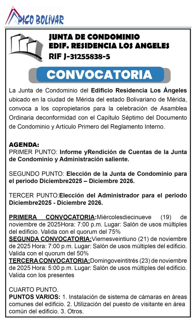CONVOCATORIA La Junta de Condominio del Edificio Residencia Los Ángeles, convoca a todos los copropietarios a la celebración de Asamblea Ordinaria, de conformidad con el Capítulo Séptimo del Documento de Condominio y el Artículo Primero del Reglamento Interno.