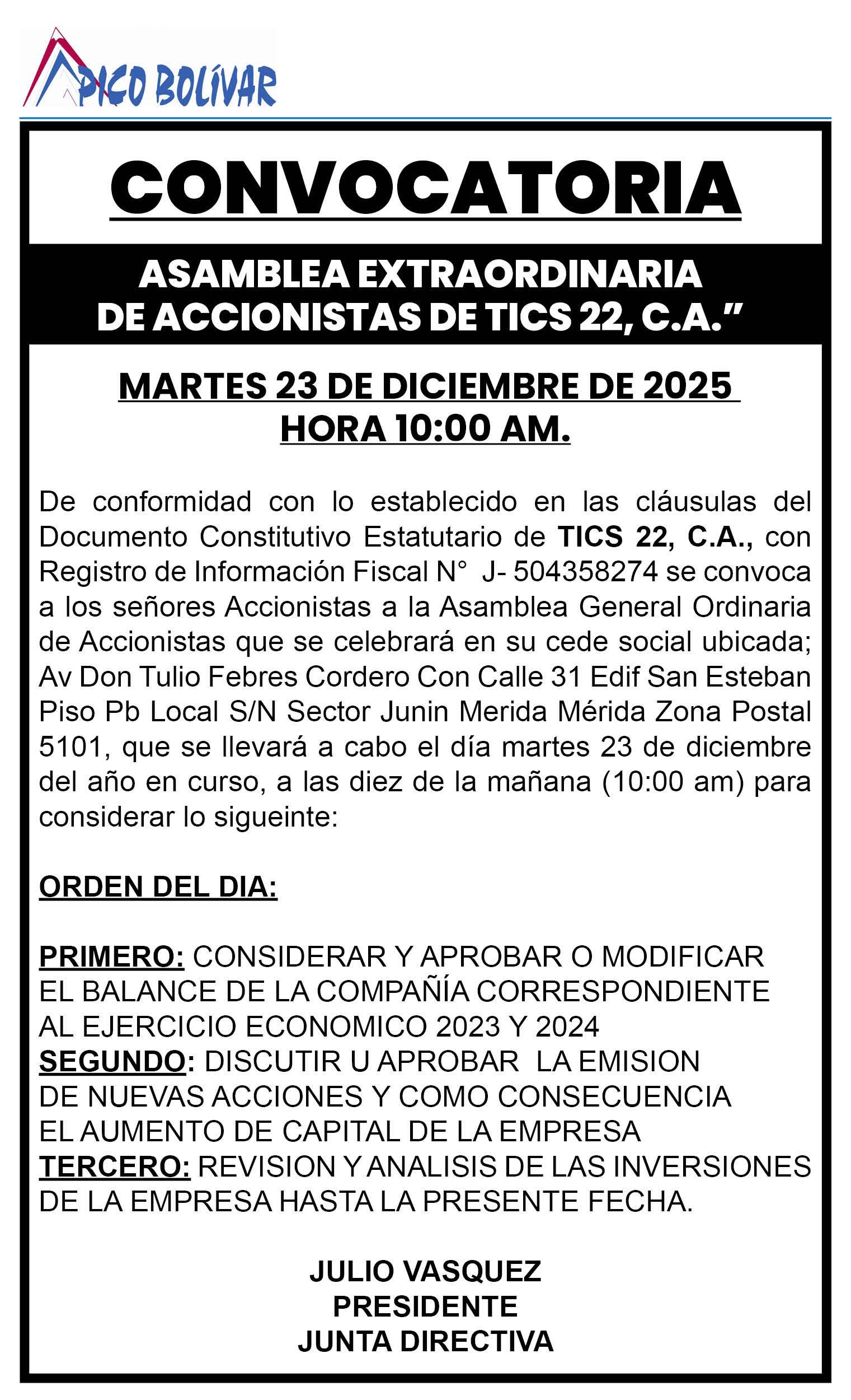 129 0 comentarios 0 FacebookTwitterPinterestEmail Redacción web publicación anterior CARTEL DE CITACIÓN A la Sociedad Mercantil «PROYECTOS Y CONSTRUCCIONES PROCONCA, C.A», representada en ese acto por su Presidente ciudadano NAYEF MAAZ YCHTA, titular de la Cedula de Identidad N° V-11.223.269 publicación siguiente CARTEL DE CITACION Al ciudadano KENYER MIGUEL MELENDEZ SANGRONIS, titular de la cédula de identidad número V-18.949.251 Related Articles CARTEL DE CITACION SE HACE SABER: Al ciudadano... 3 de febrero de 2026 CARTEL. SE HACE SABER A cuantas personas puedan... 3 de febrero de 2026 Convocatoria a Asamblea General Extraordinaria de la Asociación... 2 de febrero de 2026 Edicto mediante el cual se hace saber a... 2 de febrero de 2026 EDICTO. Se hace saber a los herederos conocidos... 2 de febrero de 2026 EDICTO. Se hace saber a todas aquellas personas... 2 de febrero de 2026 Convocatoria a Asamblea General Ordinaria de Copropietarios del... 30 de enero de 2026 Convocatoria a Asamblea General de Accionistas de S.A.... 30 de enero de 2026 Cartel Se Hace Saber Solicitud de Rectificación de Acta... 28 de enero de 2026 Segunda Convocatoria Asamblea Extraordinaria de Accionistas Valeri &... 28 de enero de 2026