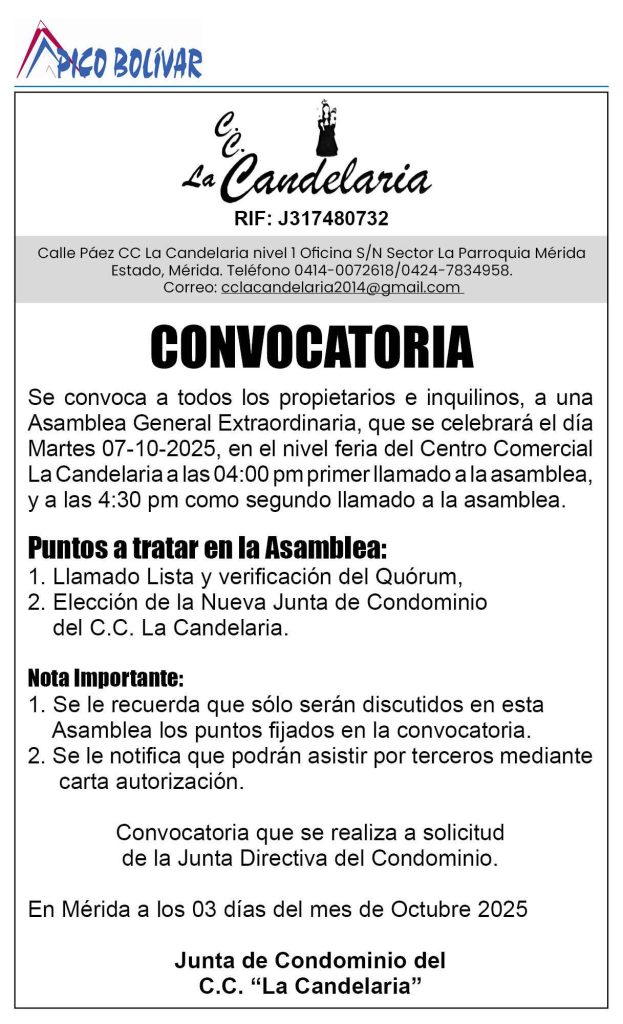 Home Avisos Legales CONVOCATORIA. Se convoca a todos los propietarios e inquilinos del Centro Comercial La Candelaria a una Asamblea General Extraordinaria, la cual se celebrará el día martes 07 de octubre de 2025, en el nivel feria del Centro Comercial