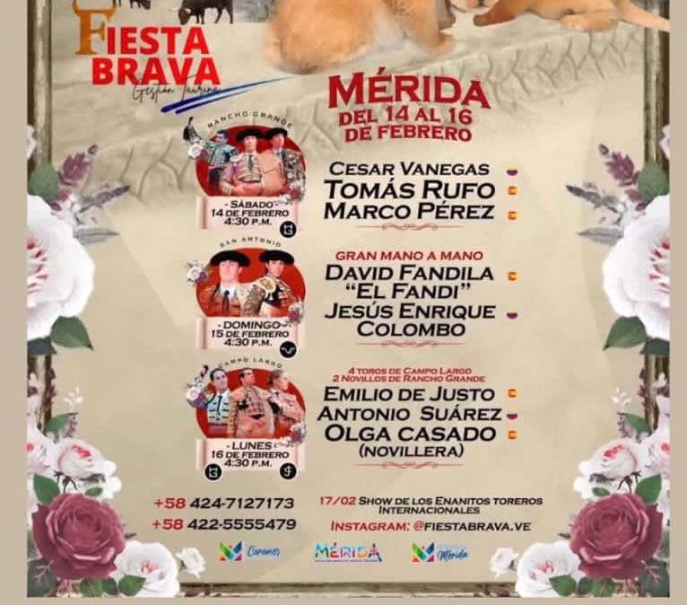 Mérida.- A paso firme, con la consagrada cita de cada año, el Carnaval Taurino de América avanza en los preparativos de la edición 2026 que reunirá a la afición regional, nacional e internacional desde el sábado 14 hasta el lunes 16 de febrero en la Monumental «Román Eduardo Sandia», con expectativas que crecen minuto a minuto, muestra de ello, es el interés registrado en taquilla para disfrutar de los carteles presentados por las empresas «Fiesta Brava» y Coremer, así lo dijo el presidente del Complejo Recreacional de Mérida, Sharif Aisami.