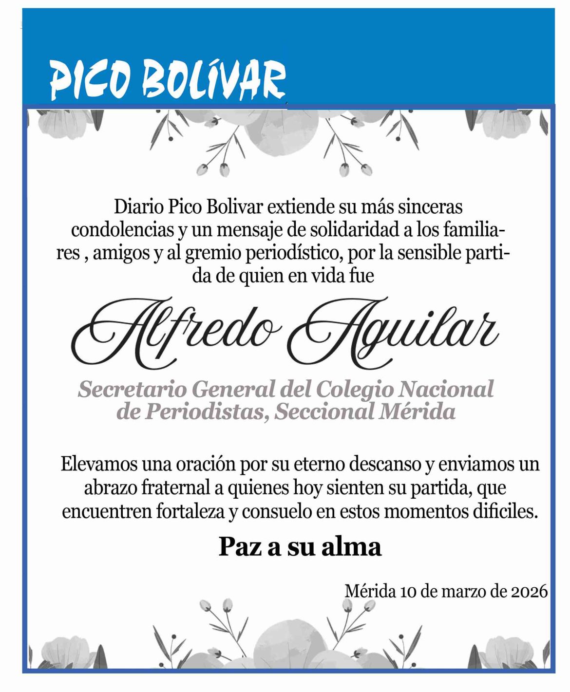 Nacionales Despedida de un gran amigo por Redacción web 10 de marzo de 2026 escrito por Redacción web 10 de marzo de 2026 17 Ya Alfredo Aguilar está en la funeraria San Antonio, las exequias fúnebres, responso 10am y misa es en el salón Cristo Rey, el sepelio mañana miercoles 11 de marzo a las 3pm en el cementerio la inmaculada 0 comentarios 0 FacebookTwitterPinterestEmail Redacción web publicación anterior Mérida fortalece su seguridad con la adecuación de 240 Cuadrantes de Paz publicación siguiente Venezuela y Dominicana calientan el Clásico Related Articles Salvó a su hija de las llamas pero... 11 de marzo de 2026 Ministra de Salud confirma muertes por fiebre amarilla... 11 de marzo de 2026 Venezuela y Dominicana calientan el Clásico 11 de marzo de 2026 Mérida fortalece su seguridad con la adecuación de... 10 de marzo de 2026 FALLECIÓ ALFREDO AGUILAR SECRETARIO GENERAL DEL CNP- MÉRIDA 10 de marzo de 2026 GREMIO MÉDICO DE MÉRIDA CONMEMORA SU DÍA CON... 10 de marzo de 2026 Médicos conmemoran su día en honor a José... 10 de marzo de 2026 Gobierno rechaza retórica hostil del senador Markwayne Mullin 10 de marzo de 2026 El CONAS en alerta ante llamadas de extorsión... 9 de marzo de 2026 Delcy Rodríguez destaca participación 9 de marzo de 2026