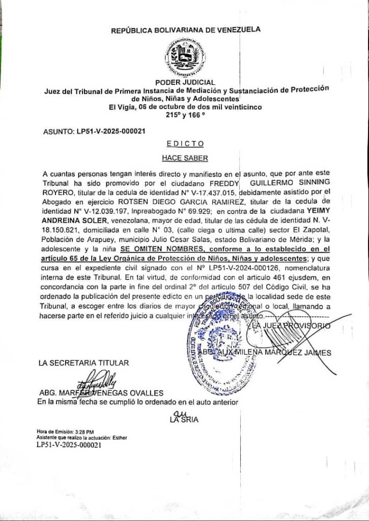 Home Avisos Legales Edicto Judicial: A cuantas personas tengan interés directo y manifiesto en el asunto – Freddy Guillermo Sinning Royero vs. Yeimy Andreina Soler y menores, Proceso Civil N° LP51-V-2024-000126