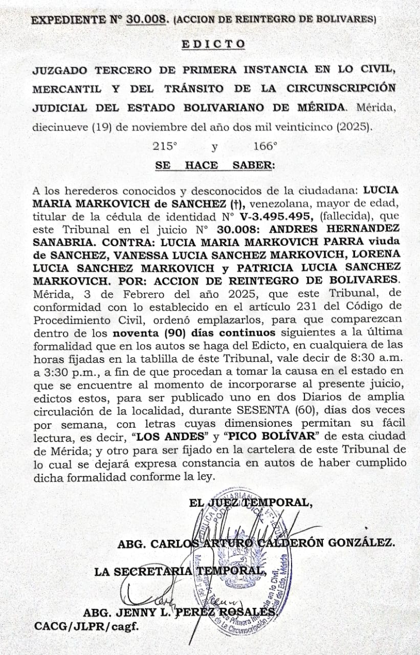 113 0 comentarios 0 FacebookTwitterPinterestEmail Redacción web publicación anterior EDICTO Se hace saber a los herederos desconocidos del causante ERNESTO BENVENUTO ALFARANO, que se crean con derechos o tengan interés directo y manifiesto, en el juicio de PRESCRIPCION ADQUISITIVA, signado con el N° 11.832, intentado por el ciudadano GERARDO ALFONSO MAYORGA PATRIZZI, titular de la cédula de identidad N° V-7.178.575 (12-01-2026) publicación siguiente Edicto de citación, notificación y emplazamiento dirigido a todas las personas que se crean con derechos, intereses directos o manifiestos sobre inmueble objeto de solicitud de sentencia declarativa de propiedad, tramitada ante el Juzgado Primero de Primera Instancia en lo Civil, Mercantil y del Tránsito de la Circunscripción Judicial del Estado Bolivariano de Mérida (12-01-2026) Related Articles Tercera y Última Convocatoria a Asamblea General Extraordinaria... 3 de marzo de 2026 Convocatoria a Asamblea Extraordinaria de Copropietarios del Conjunto... 3 de marzo de 2026 CARTEL DE CITACIÓN HACE SABER: A la ciudadana: YOLEIDY... 3 de marzo de 2026 EDICTO. Se hace saber A los HEREDEROS DESCONOCIDOS... 3 de marzo de 2026 Él Impreso 2 de marzo de 2026 Edicto. Se hace saber a los HEREDEROS DESCONOCIDOS... 2 de marzo de 2026 CARTEL DE INTIMACION HACE SABER: Al ciudadano ALI... 2 de marzo de 2026 A.C. Mérida Country Club: Segunda Convocatoria a Asamblea... 2 de marzo de 2026 EDICTO. Se hace saber a los HEREDEROS DESCONOCIDOS... 27 de febrero de 2026 Certificación del Acta N° 039 (Año 2015) de... 26 de febrero de 2026