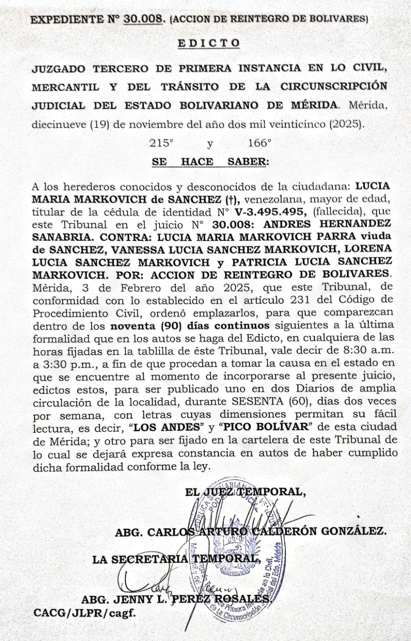 Avisos Legales Edicto judicial convoca a herederos de Lucía María Markovich de Sánchez por acción de reintegro de bolívares (29-12-2025) por Redacción web 29 de diciembre de 2025 escrito por Redacción web 29 de diciembre de 2025 48 0 comentarios 0 FacebookTwitterPinterestEmail Redacción web publicación anterior Descarrilamiento del Tren Interoceánico en el sur de México deja 13 fallecidos publicación siguiente PRESCRIPCIÓN ADQUISITIVA – EDICTO Se hace saber que Dulce Margarita Torres Hernández solicita sentencia sobre un inmueble en El Playón, Mérida, actualmente poseído por Gerardo Enrique González Guerra desde 2009. Interesados deben comparecer ante este Juzgado dentro de quince (15) días de la última publicación. (29-12-2025) Related Articles Edicto mediante el cual el Tribunal de Primera... 15 de enero de 2026 Edicto de citación, notificación y emplazamiento dirigido a... 12 de enero de 2026 Edicto judicial convoca a herederos de Lucía María... 12 de enero de 2026 EDICTO Se hace saber a los herederos desconocidos... 12 de enero de 2026 Edicto de citación, notificación y emplazamiento dirigido a... 5 de enero de 2026 Edicto judicial convoca a herederos de Lucía María... 5 de enero de 2026 EDICTO Se hace saber a los herederos desconocidos... 5 de enero de 2026 PRESCRIPCIÓN ADQUISITIVA – EDICTO Se hace saber que... 5 de enero de 2026 Edicto de Llamamiento hace saber a todas aquellas personas... 30 de diciembre de 2025 PRESCRIPCIÓN ADQUISITIVA – EDICTO Se hace saber que... 29 de diciembre de 2025
