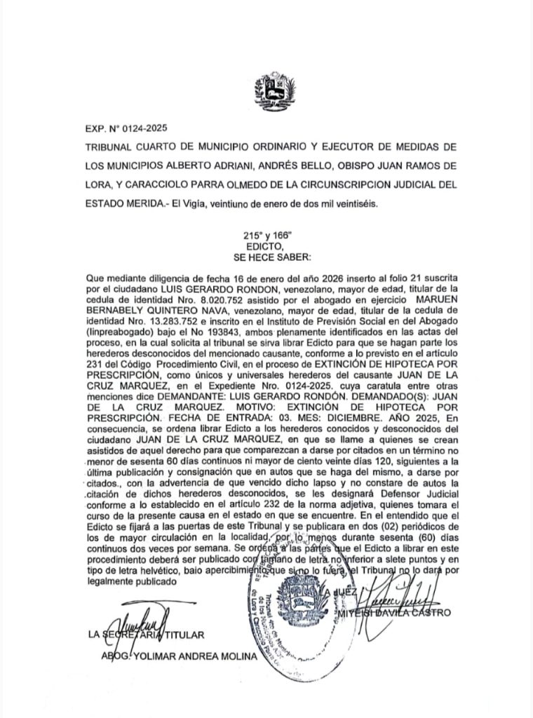 Avisos Legales EDICTO LUIS GERARDO RONDON. EXP N° 0124-2025 por Redacción web 17 de abril de 2026 escrito por Redacción web 17 de abril de 2026 5 0 comentarios 0 FacebookTwitterPinterestEmail Redacción web publicación anterior Autoridades rastrean a expareja de una enfermera asesinada publicación siguiente Hallan a Grecia «N» joven reportada como desaparecida, exceso de filtros entorpeció su búsqueda Related Articles CARTEL SE HACE SABER Al ciudadano ABEL ZERPA... 20 de abril de 2026 CARTEL DE CITACION HACE SABER:A la SOCIEDAD MERCANTIL... 18 de abril de 2026 Edicto se hace saber a todas las personas... 17 de abril de 2026 CARTEL DE CITACION a la ciudadana BEATRIZ SOLEDAD... 17 de abril de 2026 Edicto a las Personas con Interés Directo en... 16 de abril de 2026 Cartel Se Hace Saber a cuantas personas puedan... 16 de abril de 2026 Edicto: Se hace saber a todas aquellas personas... 15 de abril de 2026 Convocatoria a Asamblea General Ordinaria de Copropietarios de... 15 de abril de 2026 Edicto: Llamado a Interesados y Posibles Herederos del... 15 de abril de 2026 CARTEL DE CITACION HACE SABER Al ciudadano WILLIAM... 15 de abril de 2026