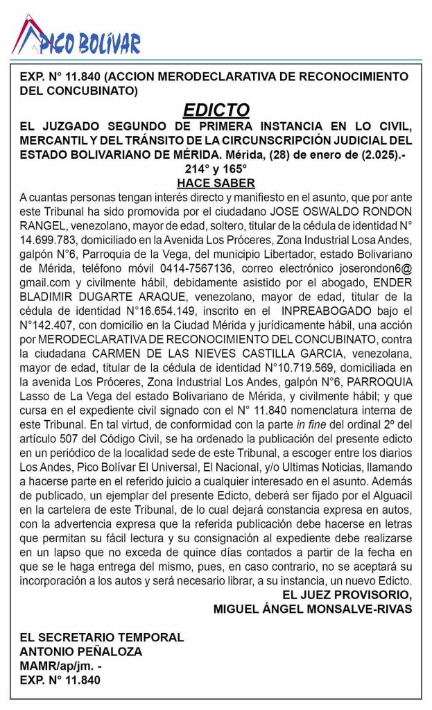 Edicto, mediante el cual se hace saber a cuantas personas tengan interés directo y manifiesto en el asunto promovido por el ciudadano Jose Oswaldo Rondón Rangel contra la ciudadana Carmen de las Nieves Castilla García sobre acción merodeclarativa de reconocimiento del concubinato.